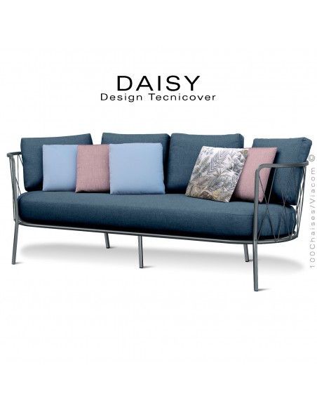 Salon de jardin, canapé lounge 3 places DAISY, structure acier peint anthracite, assise avec quatre coussins bleu-marine.