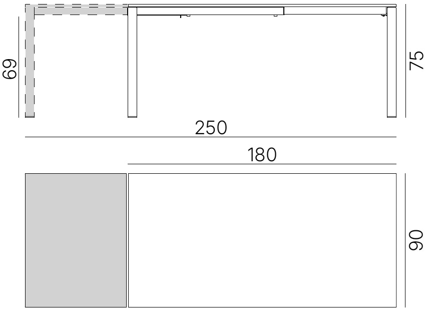 Table repas d'extérieur à rallonge ou extensible EXTIA-250, structure 4 pieds en tube d'acier carré 80x80 mm., avec molettes de mise à niveau et tampons plastique de protection des sols. Plateau dimensions fermé 1800x900 mm. (1480x90 cm.), position plateau avec rallonge ouvert 2500x900 mm., (250x90 cm., rallonge de 70 cm.), intégrée dans la structure. Plateau épaisseur 25 mm., en tôle d'acier avec chant à 90° légèrement arrondie avec renfort de structure. Finition de la table en acier galvanisé avec une peinture poudre. Livraison piétement démonté.