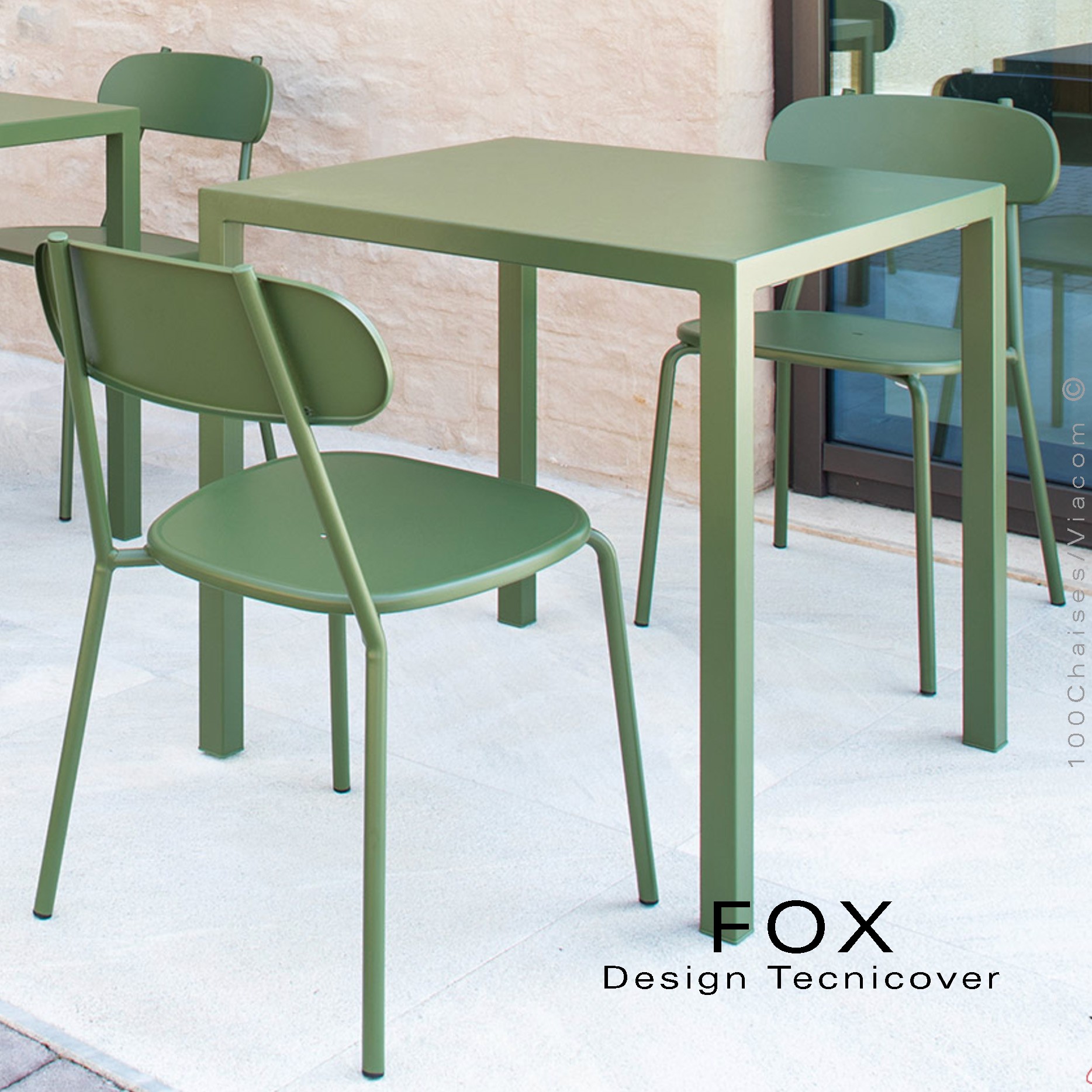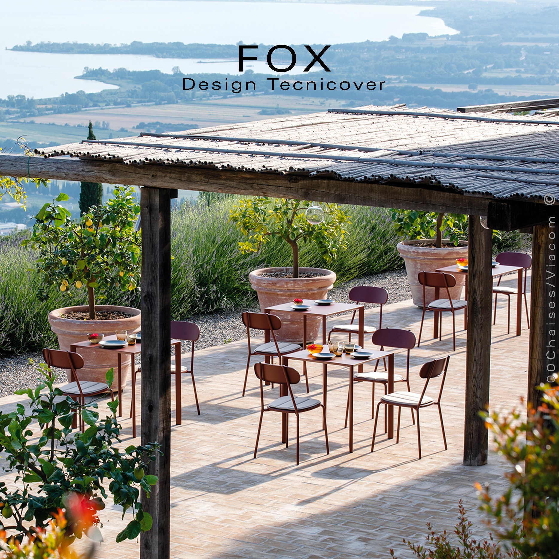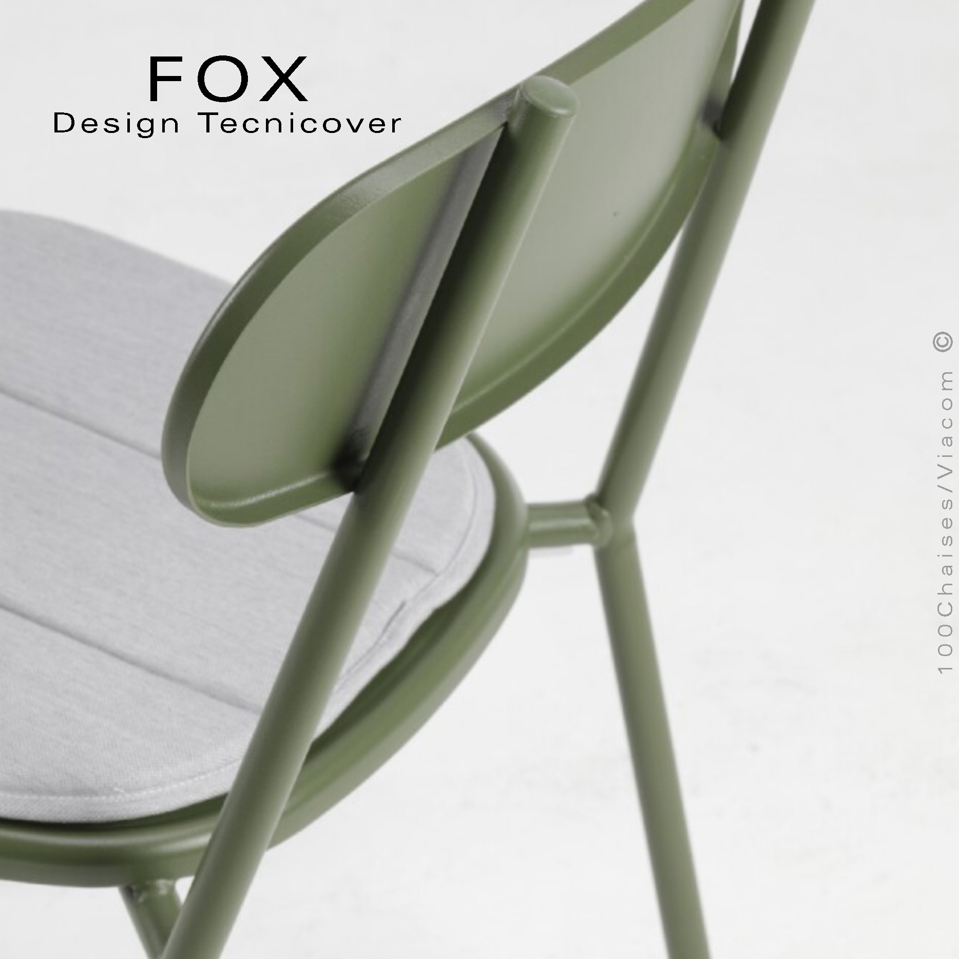 FOX est une chaise d'esprit rétro, en tube d'acier galvanisé rond Ø22 mm., composée de quatre pieds léger et empilable. Cette chaise se déplace et se range facilement. L'assise et le dossier sont en tôles d'aciers embouties. Les couleurs poudres époxy sont disponibles en standard en blanc, blanc perle, anthracite, noir, gris Tourterelle, beige, bronze, mais elle peut également être personnalisable à la demande dans une couleur spéciale pour créer une solution unique. Pour en faire un meuble élégant, nous l'avons agrémentée d'un coussin capitonné avec aimant d'un épaisseur de 30 mm. de mousse polyuréthane, suivant la forme arrondie de l'assise. L'habillage du coussin se fait dans un tissu de haute qualité hydrofuge, résistant aux rayons U.V., conservant ainsi les couleurs pendant longtemps dans la gamme BUISNESS, couleurs aux choix voir palette fabricant (image).