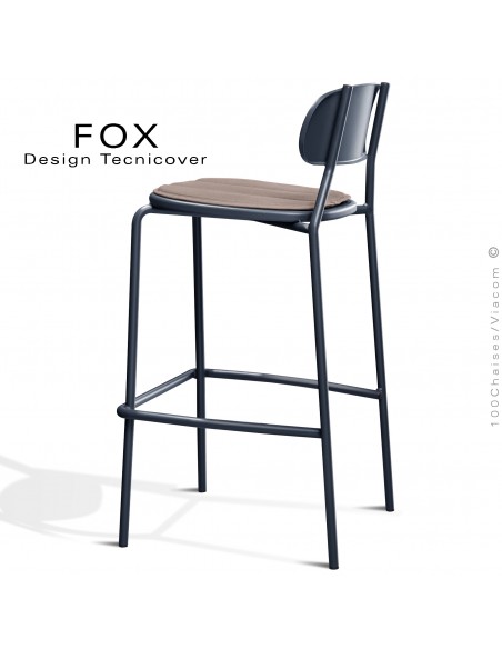 Tabouret de bar rétro d'extérieur FOX, structure acier peint anthracite, assise avec coussin aimanté couleur écru.