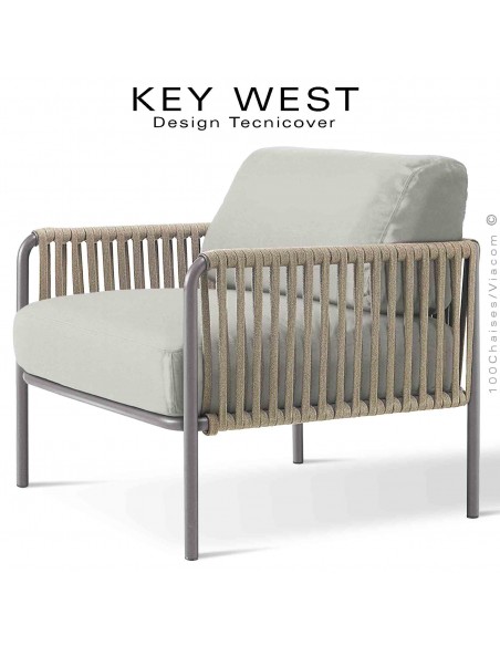 Fauteuil d'extérieur KEY-WEST, acier peint gris Tourterelle, assise deux coussins, habillage tissu crème, tressage corde crème.