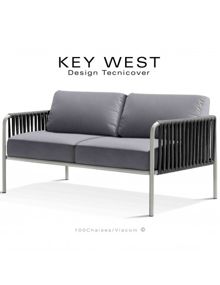 Canapé d'extérieur KEY-WEST, acier blanc perle, assise 2 places avec coussins tissu argent, tressage corde marine noir.