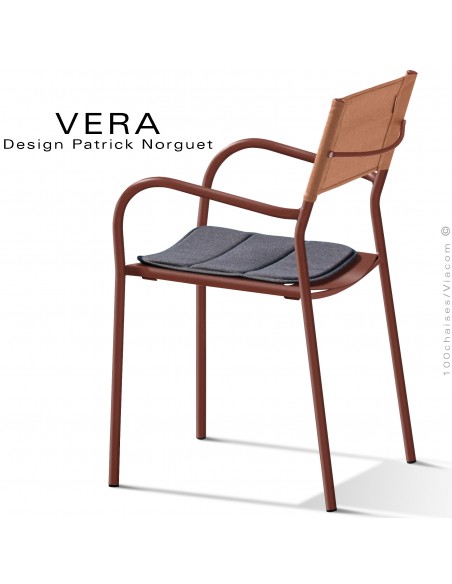 Fauteuil repas d'extérieur VERA, structure acier galvanisé peint terracotta, dossier Batyline ocre, coussin anthracite.