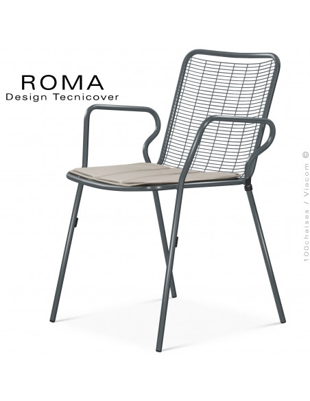 Fauteuil repas d'extérieur ROMA, structure acier galvanisé peint anthracite avec accoudoirs et coussin couleur argile.