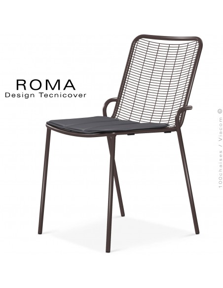 Chaise repas d'extérieur ROMA, structure acier galvanisé peint bronze, avec coussin couleur gris foncé.
