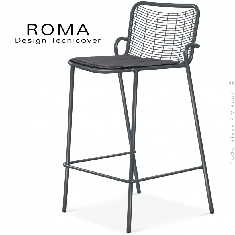 Tabouret de bar d'extérieur ROMA, structure acier galvanisé peint anthracite, assise avec coussin couleur gris foncé.