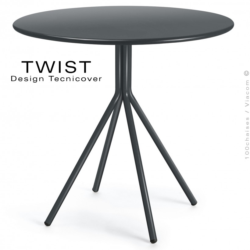 Table ronde pour extérieur TWIST, structure acier galvanisé peint anthracite, plateau tôle Ø80 cm., chant arrondie.