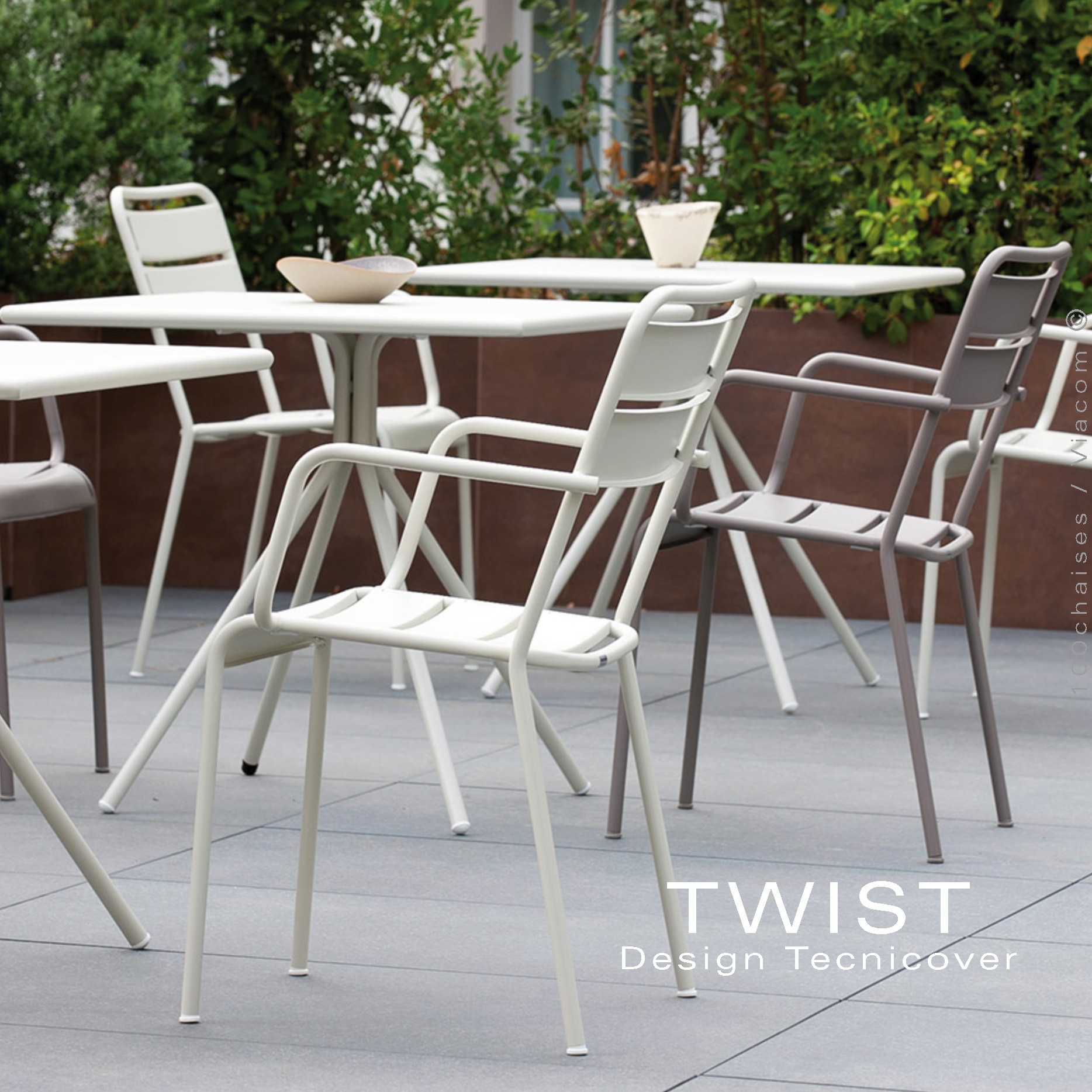 Table carré pour extérieur TWIST, structure acier galvanisé peint, plateau tôle 70x70 - 80x80 - 90x90 cm., chants aux choix.