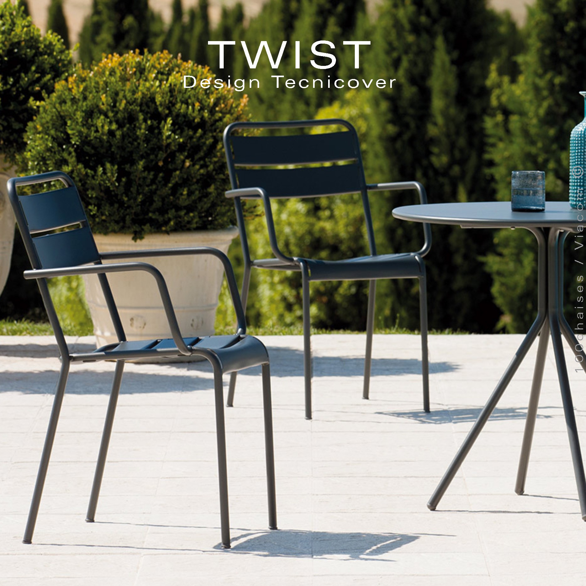 Table carré pour extérieur TWIST, structure acier galvanisé peint gris Tourterelle, plateau tôle 70x70 cm., chant arrondie.