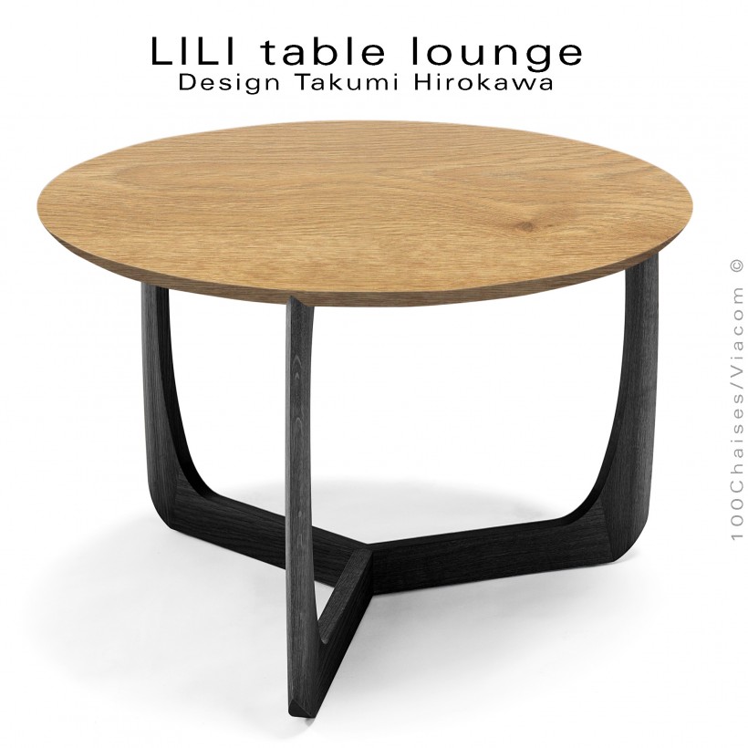 Table basse design LILI, plateau rond Ø60, chêne massif huilé ou teinté noir, piétement H.46 chêne massif huilé ou teinté noir.
