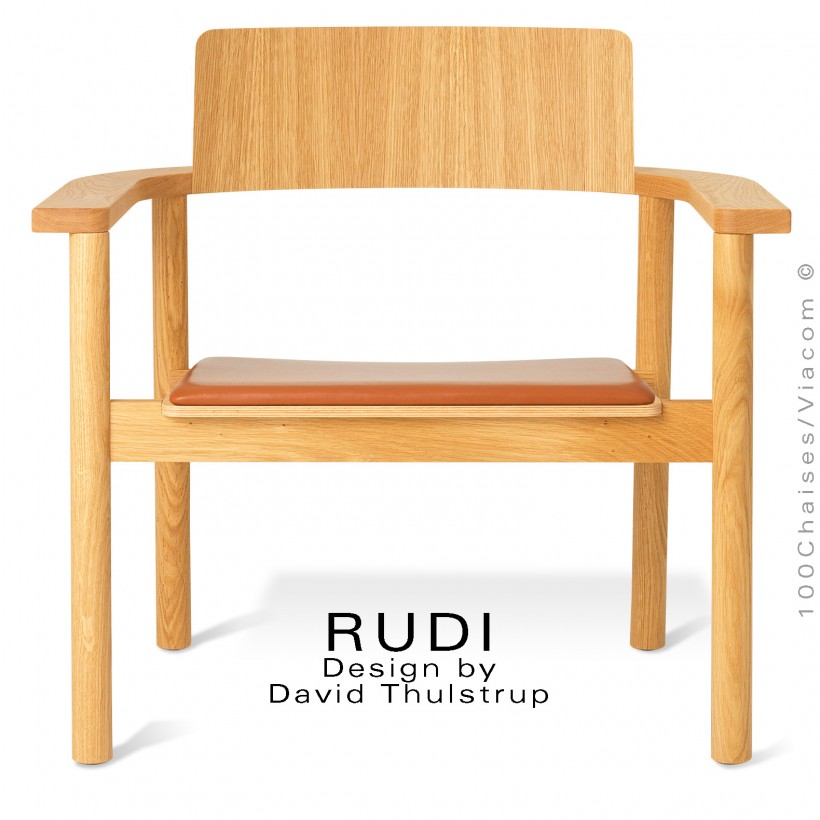 Fauteuil en chêne design RUDI Lounge, structure à quatre pieds cylindriques de Ø60 mm., de diamètre, avec accoudoirs, dossier et assise courbes en multiplis de bois cintré à la vapeur, finition placage chêne naturel. Finition possible : bois huilé, huilé blanc ou teinté noir. Avec tampons de protection pour les sols. Fauteuil empilable. Largeur entre accoudoirs : 49 cm. Option possible avec coussin fixe, garnis de mousse et habillage en cuir naturel de la gamme Sydney du fabricant CAMO, disponible en trois couleurs standard : Cognac, Sable et Noir. Gamme cuir naturel SYDNEY tire son nom de ses qualités : chaleureux, accueillant et légèrement différent. Il s'agit d'un cuir semi-aniline légèrement corrigé qui tire son charme de sa structure souple et flexible. La finition résistante du cuir en fait un excellent cuir pour le marché privé et contractuel. SYDNEY a toujours été un cuir très apprécié pour ses qualités et ses 38 couleurs différentes.