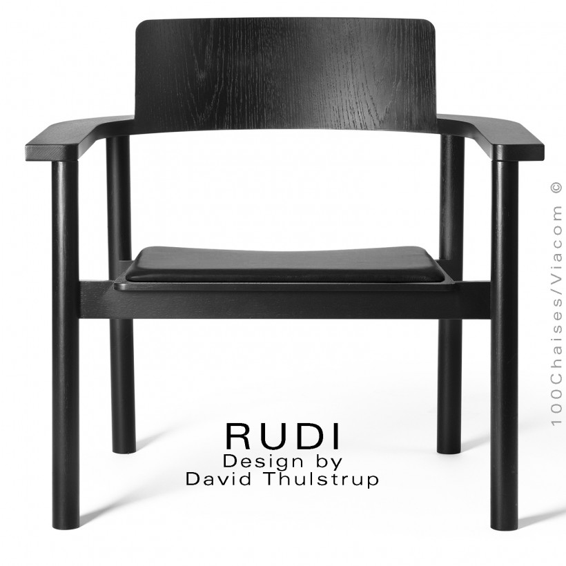 Fauteuil lounge en bois massif de Chêne RUDI, finition teinté noir, assise mousse, habillage cuir Sydney couleur noir.