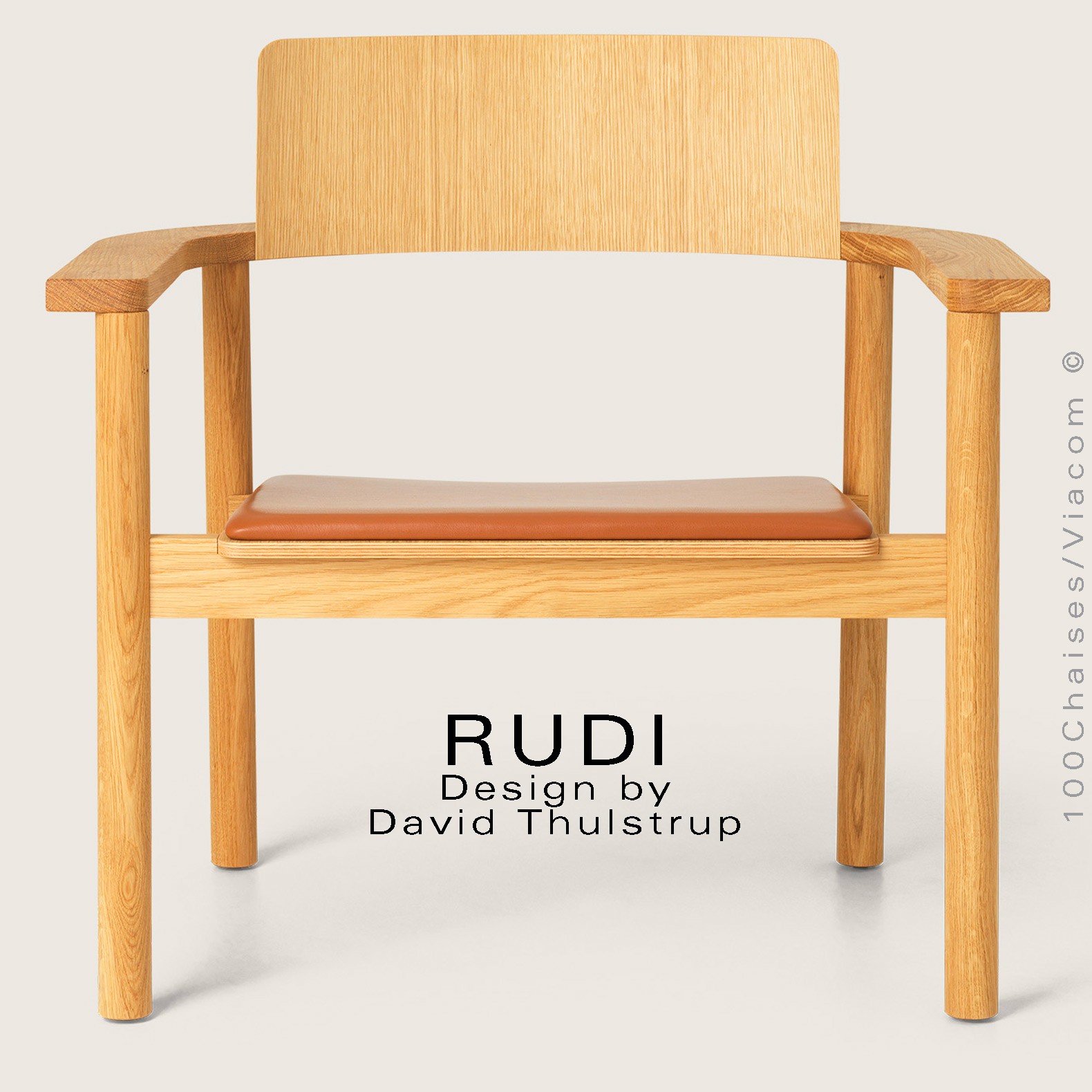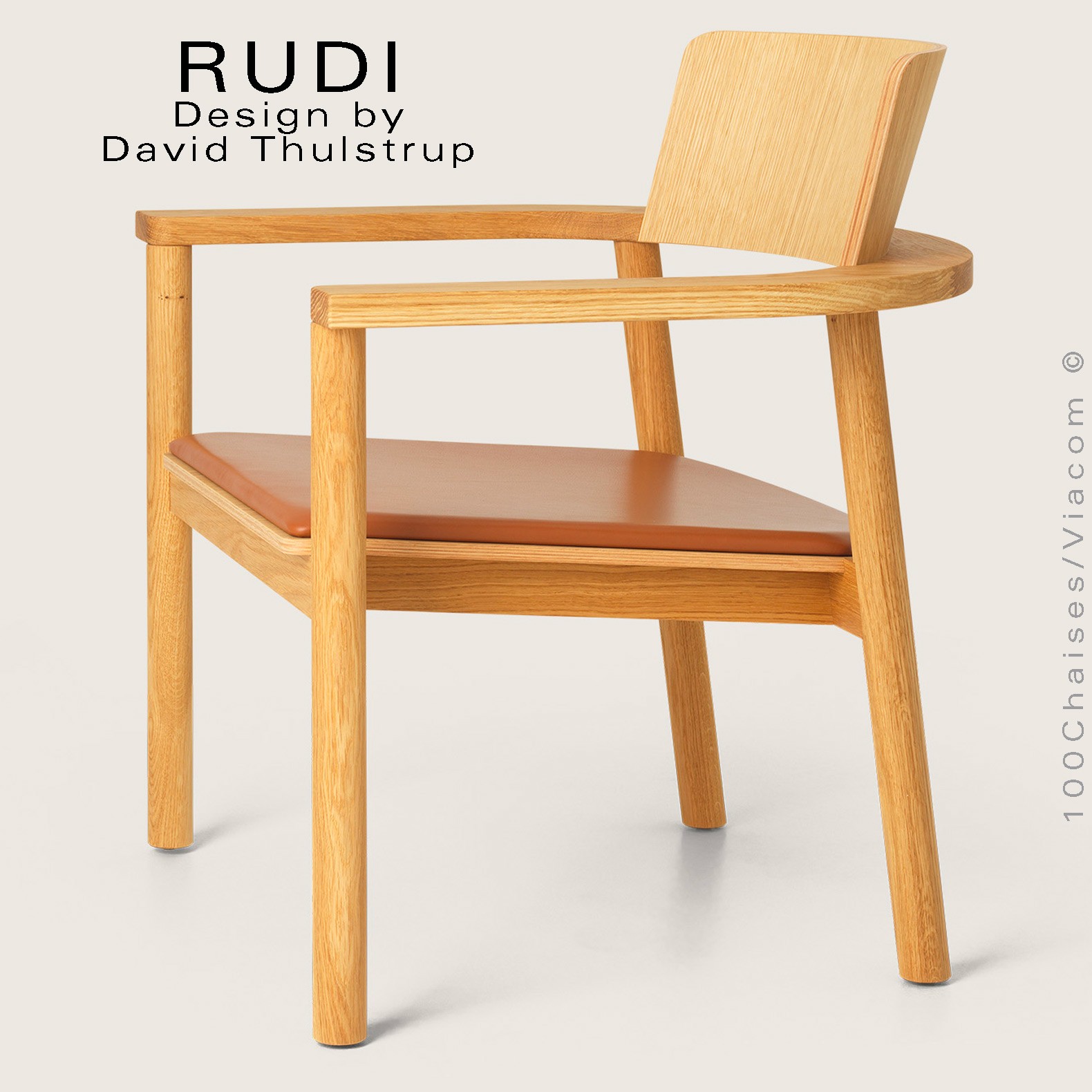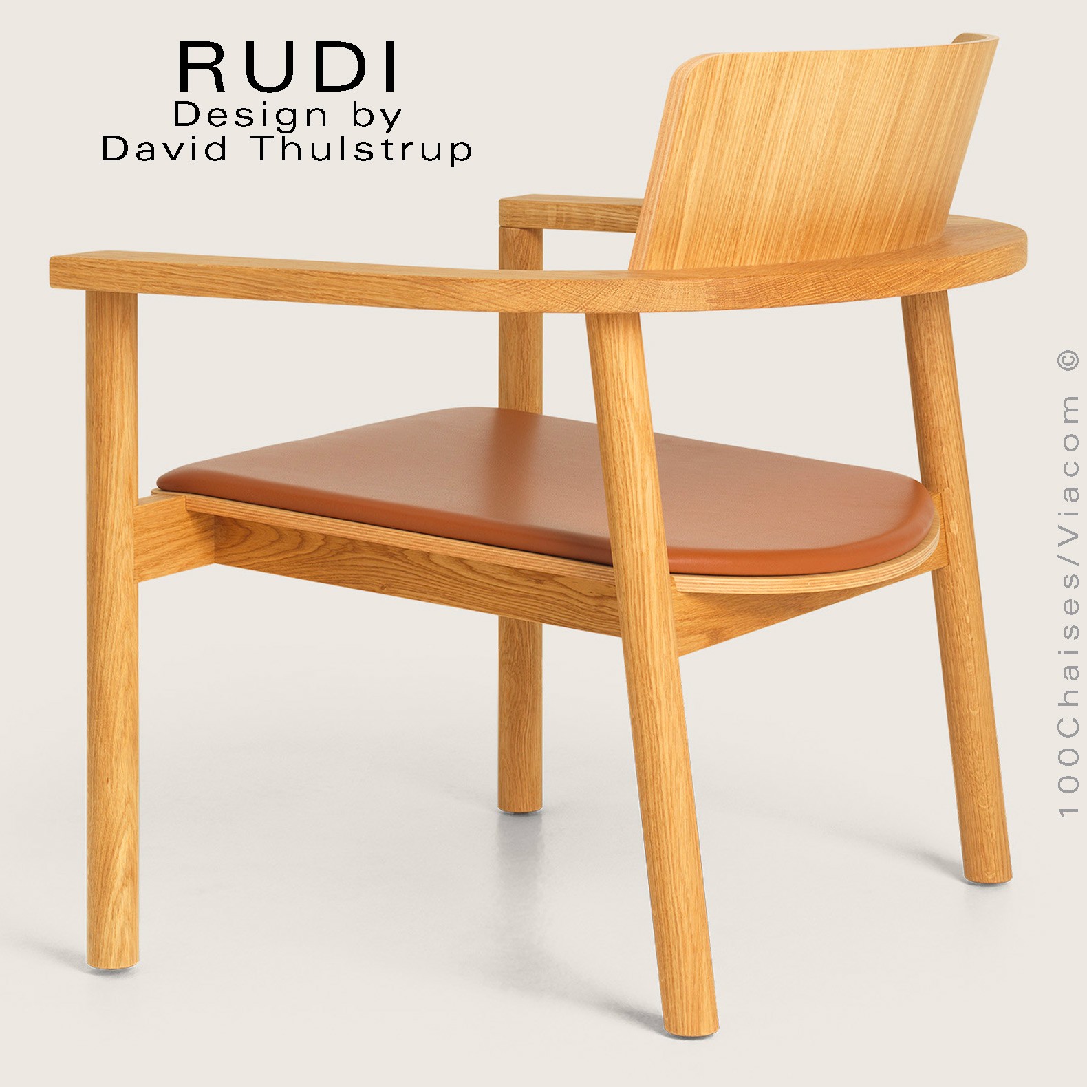 Fauteuil en chêne design RUDI Lounge, structure à quatre pieds cylindriques de Ø60 mm., de diamètre, avec accoudoirs, dossier et assise courbes en multiplis de bois cintré à la vapeur, finition placage chêne naturel. Finition possible : bois huilé, huilé blanc ou teinté noir. Avec tampons de protection pour les sols. Fauteuil empilable. Largeur entre accoudoirs : 49 cm. Option possible avec coussin fixe, garnis de mousse et habillage en cuir naturel de la gamme Sydney du fabricant CAMO, disponible en trois couleurs standard : Cognac, Sable et Noir. Gamme cuir naturel SYDNEY tire son nom de ses qualités : chaleureux, accueillant et légèrement différent. Il s'agit d'un cuir semi-aniline légèrement corrigé qui tire son charme de sa structure souple et flexible. La finition résistante du cuir en fait un excellent cuir pour le marché privé et contractuel. SYDNEY a toujours été un cuir très apprécié pour ses qualités et ses 38 couleurs différentes.