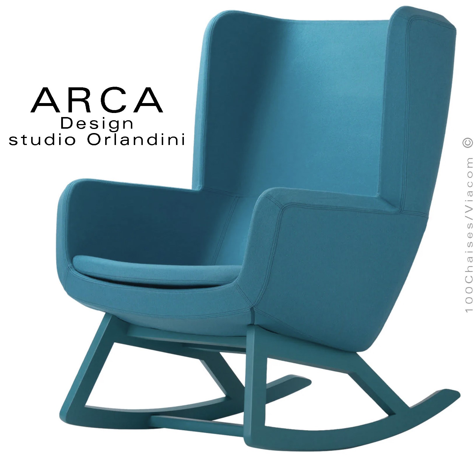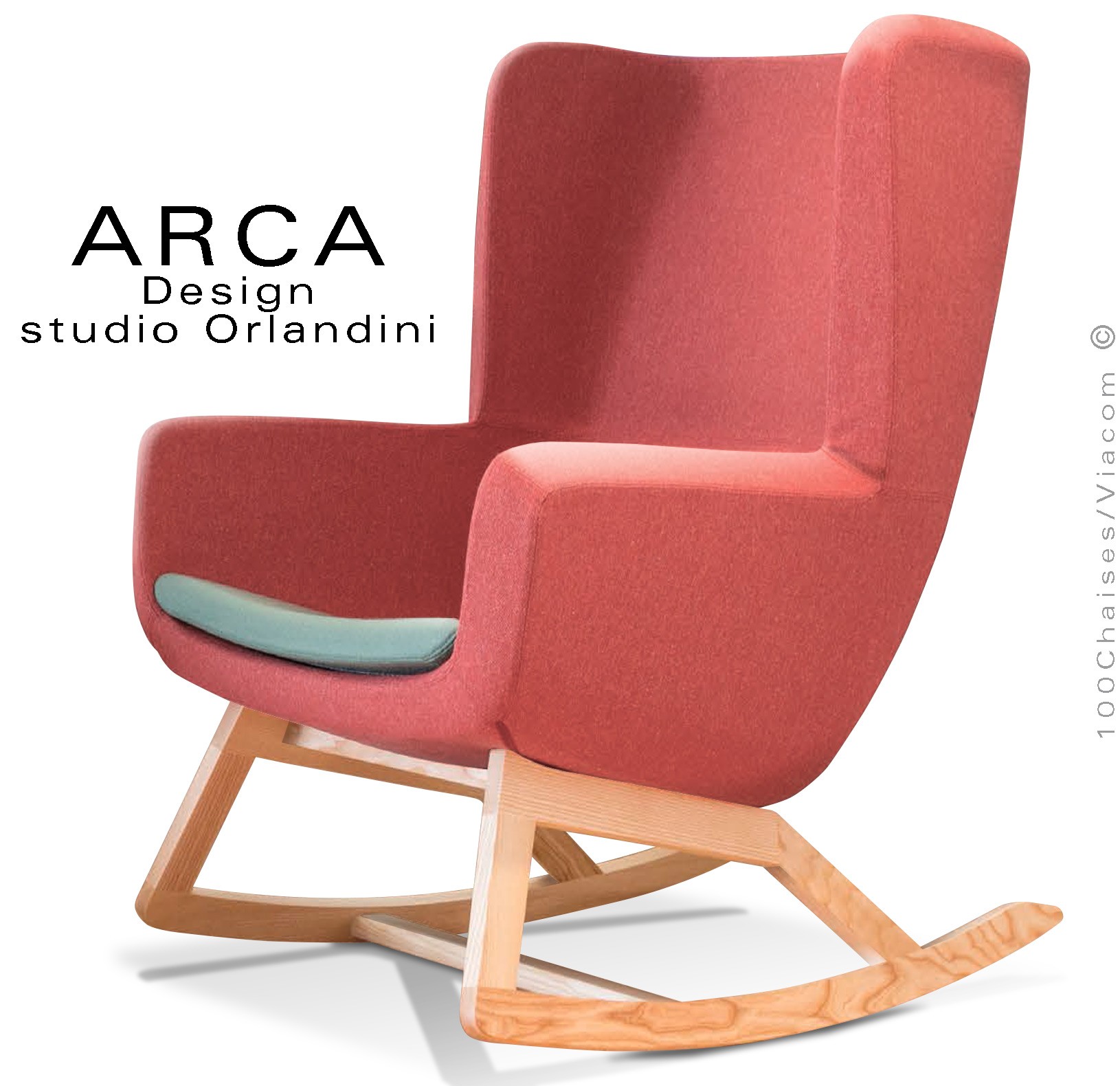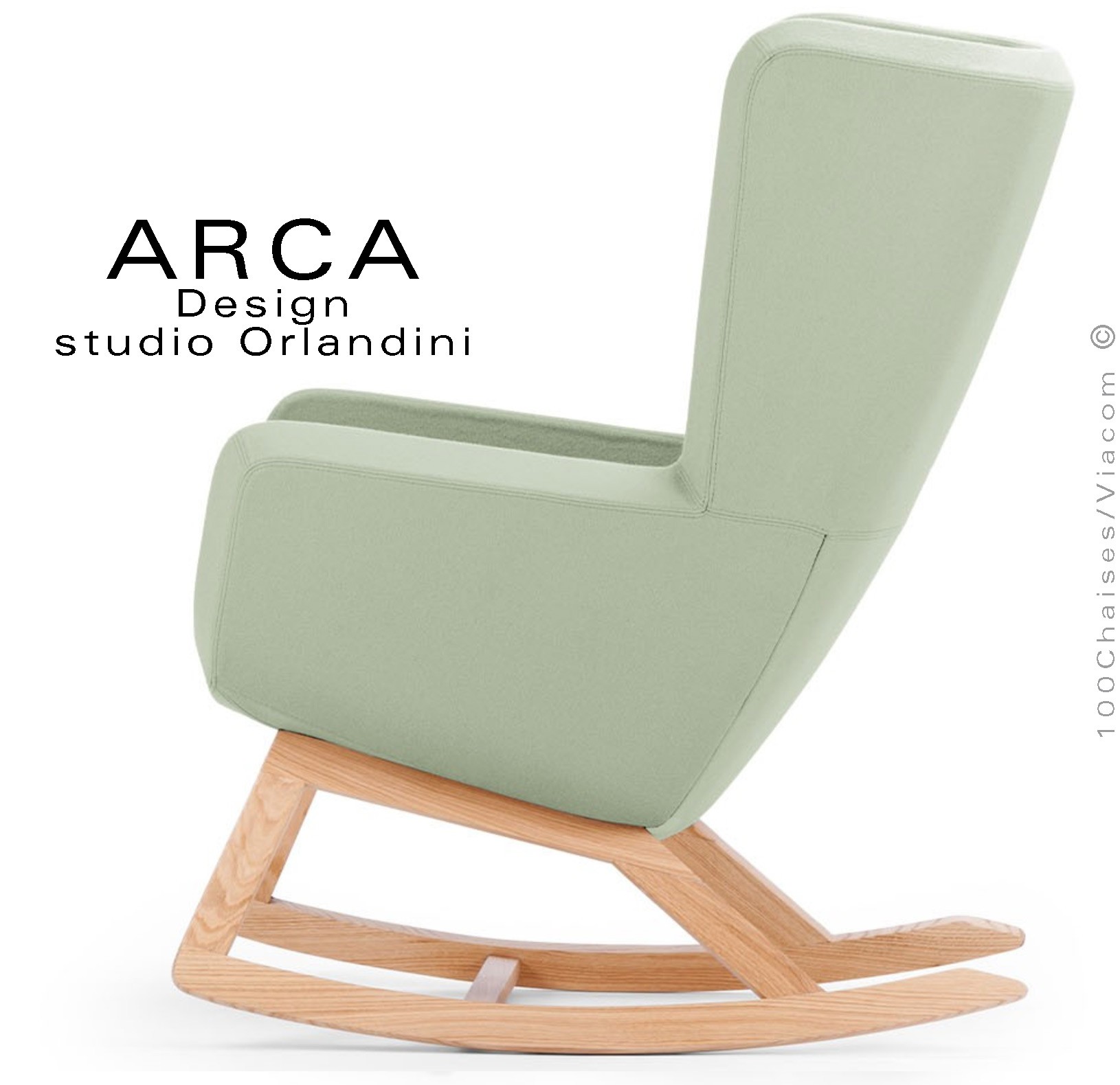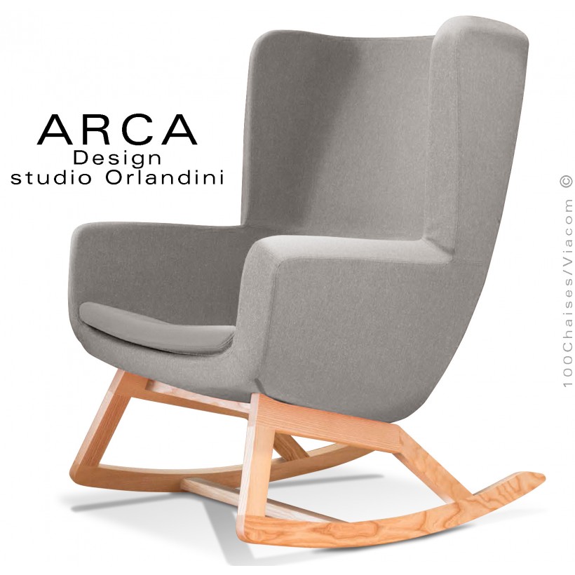 Fauteuil à bascule rocking chair lounge ARCA, structure interne en acier associée à un rembourrage en mousse moulée et injectée à froid. Piétement et structure 4 pieds en bois massif de Frêne, patins ou skis courbe et légèrement conique, extrémités arrondies, finition vernis naturel ou peint (autre sur demande voir palette fabricant). Assise et dossier haut avec accoudoirs, habillage tissu tissé gamme ERA du fabricant Camira, composition 100% polyester. Flammabilité : EN 1021 - 1 (cigarette) - EN 1021 - 2 (allumette).