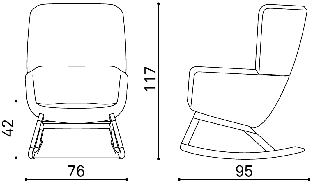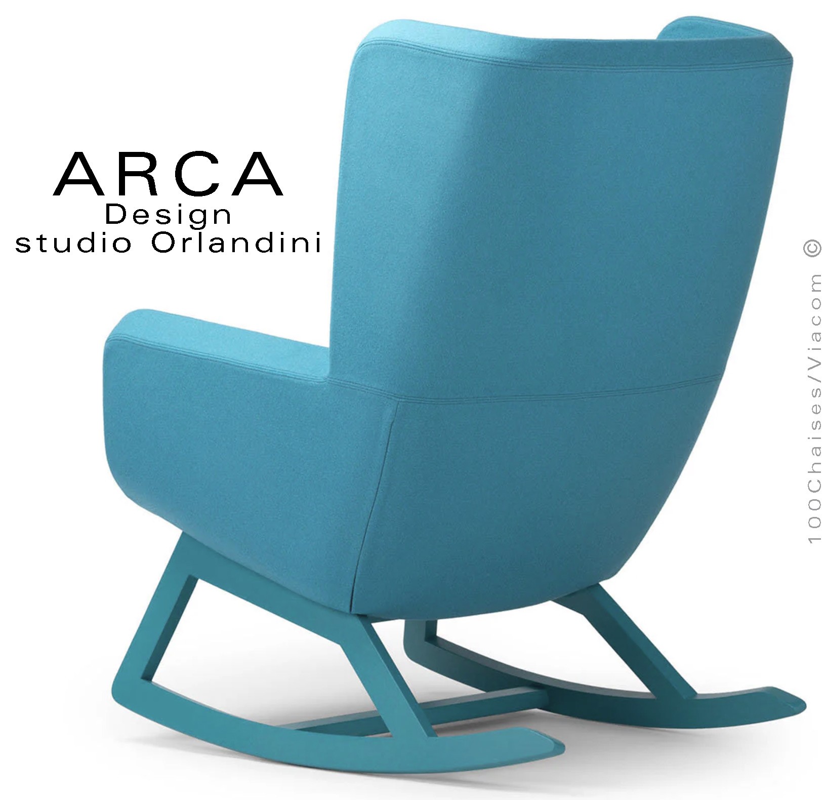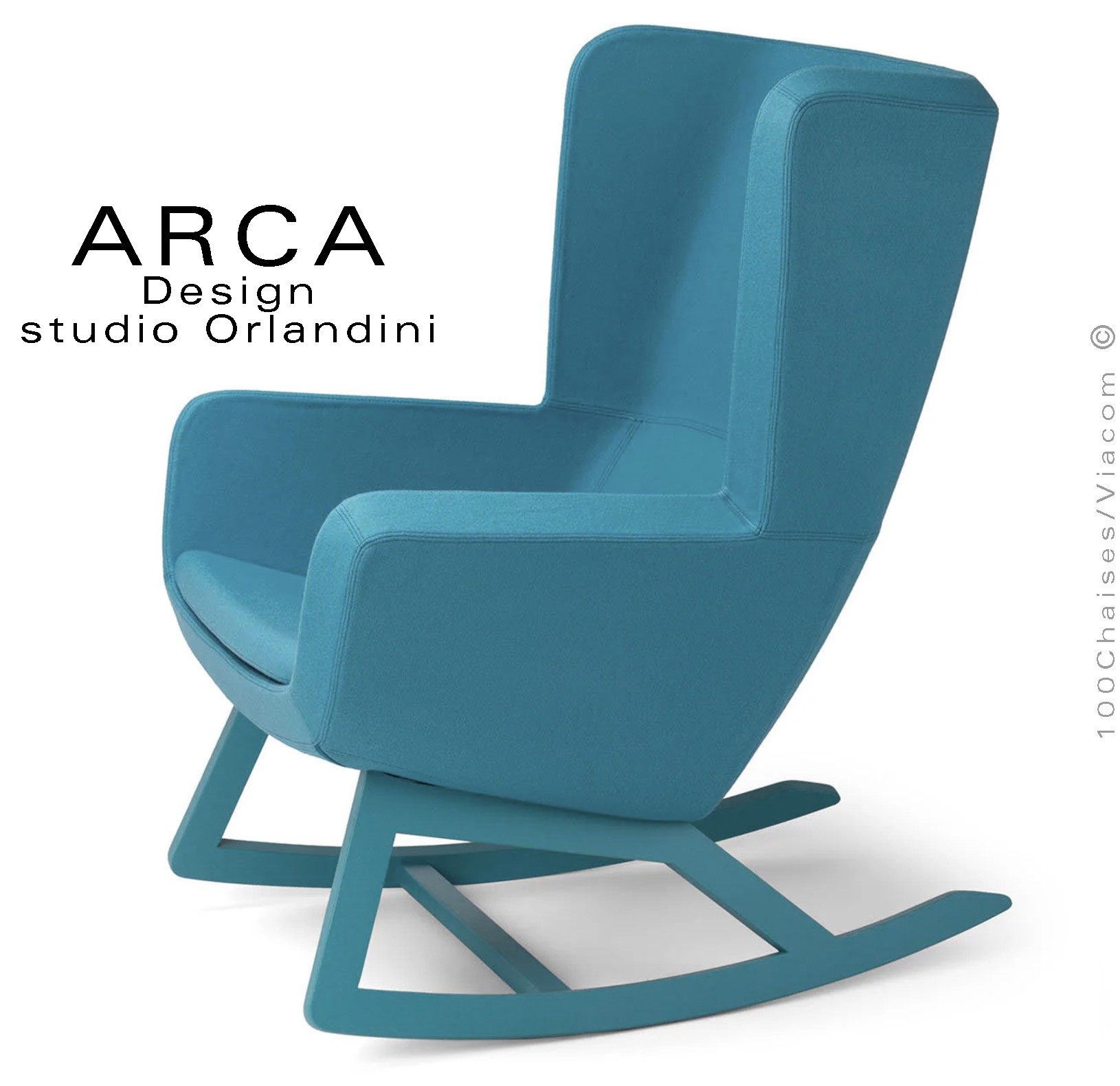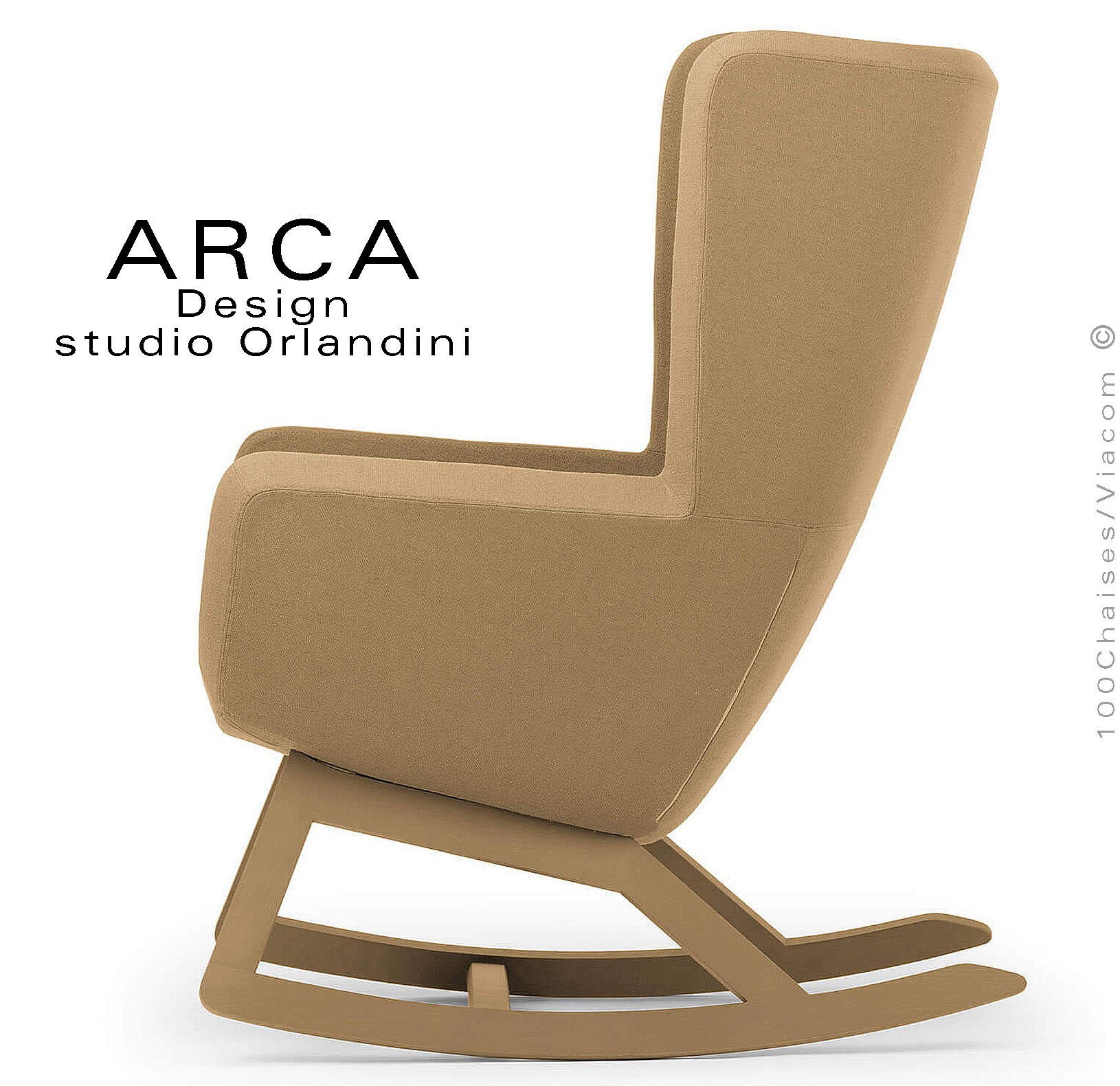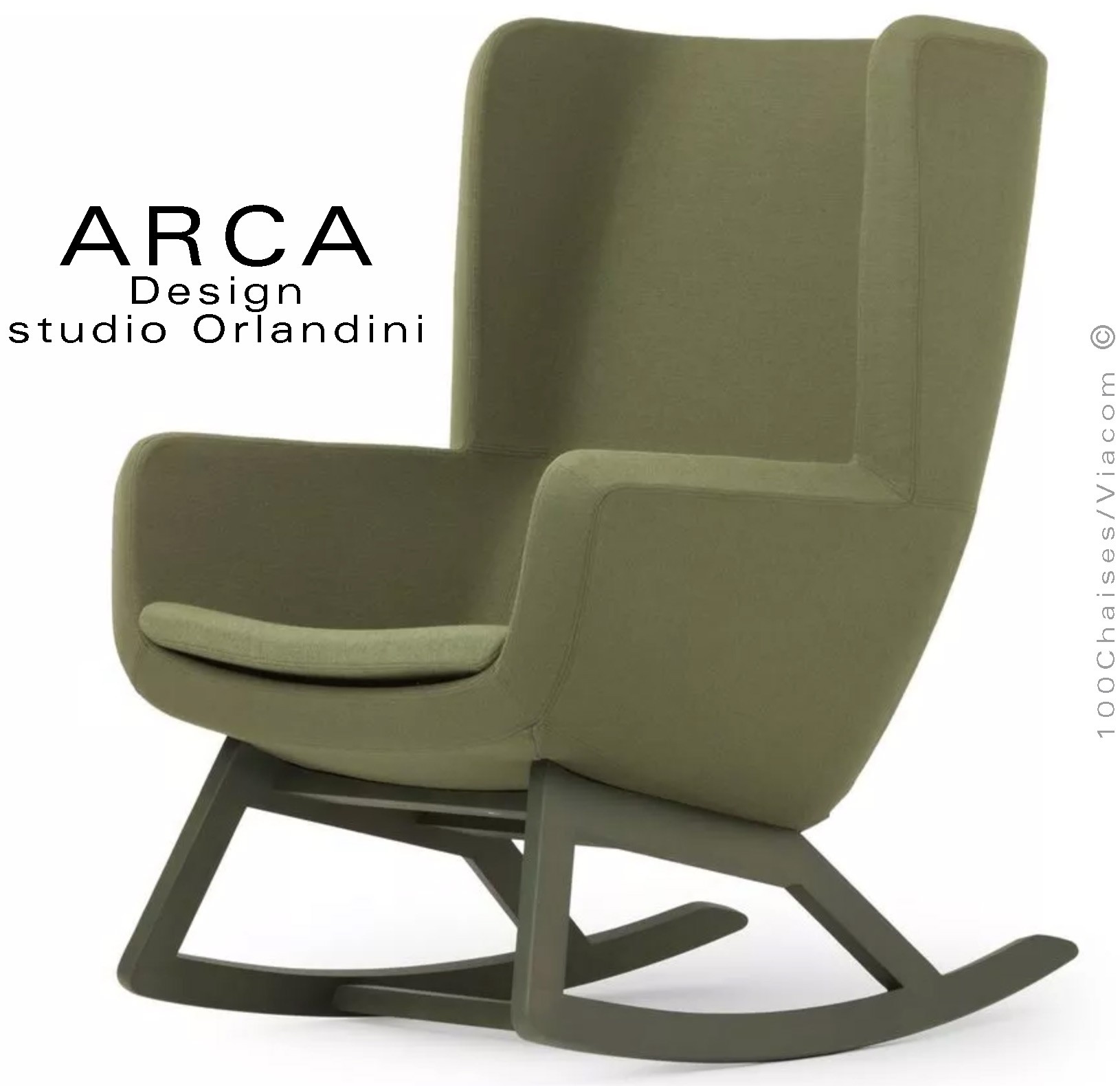 Fauteuil à bascule rocking chair lounge ARCA, structure interne en acier associée à un rembourrage en mousse moulée et injectée à froid. Piétement et structure 4 pieds en bois massif de Frêne, patins ou skis courbe et légèrement conique, extrémités arrondies, finition vernis naturel ou peint (autre sur demande voir palette fabricant). Assise et dossier haut avec accoudoirs, habillage tissu tissé gamme ERA du fabricant Camira, composition 100% polyester. Flammabilité : EN 1021 - 1 (cigarette) - EN 1021 - 2 (allumette).