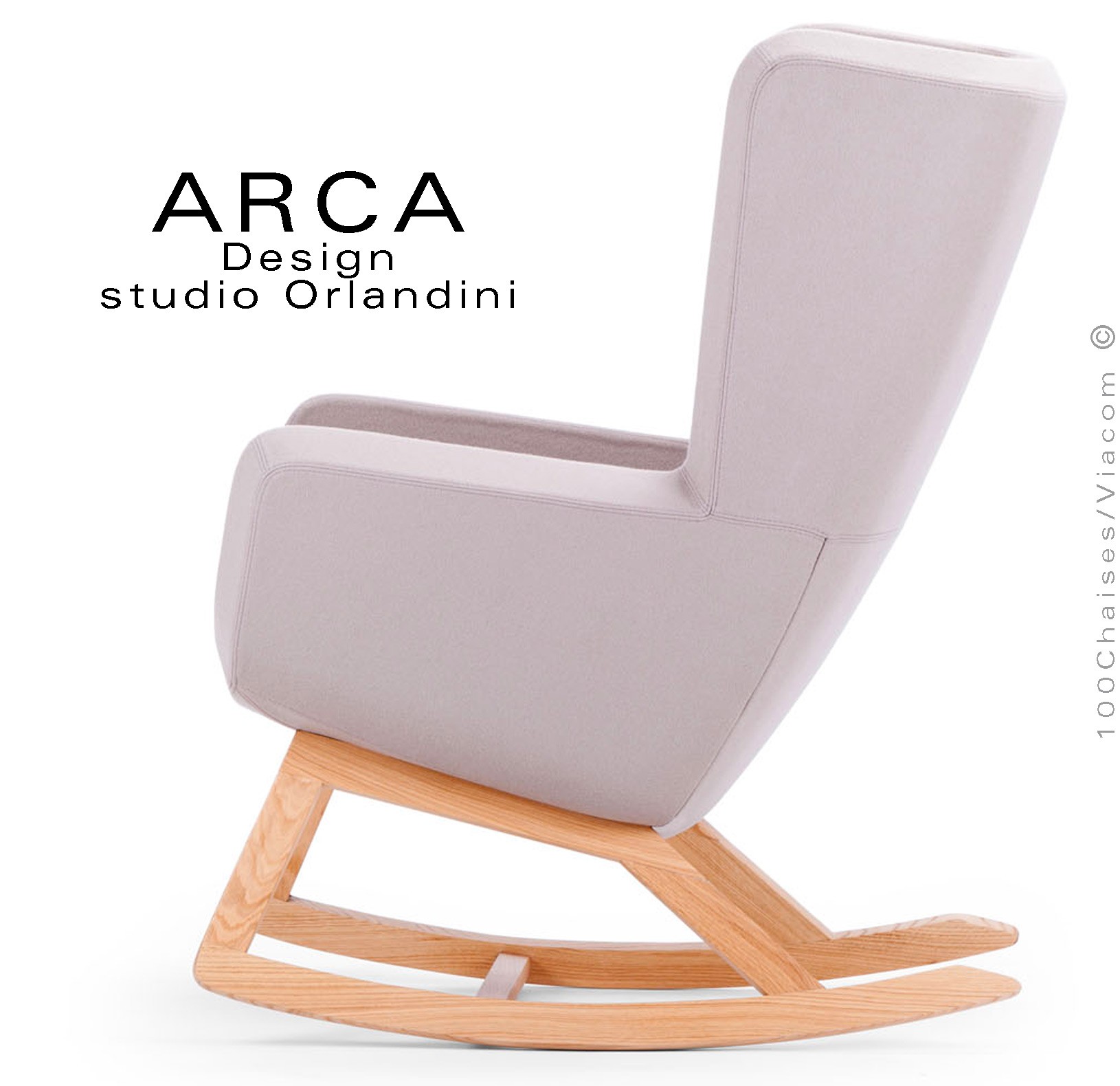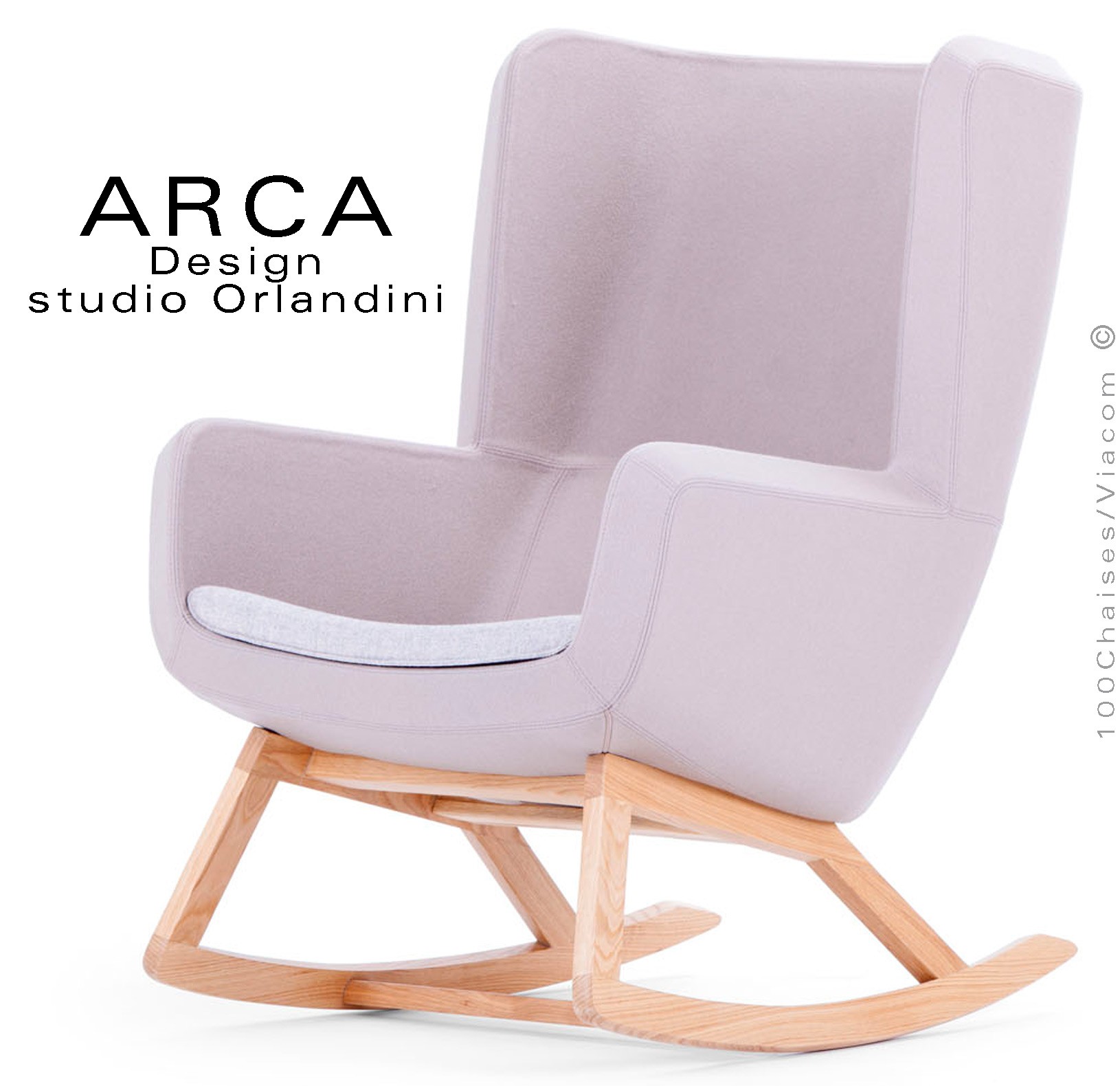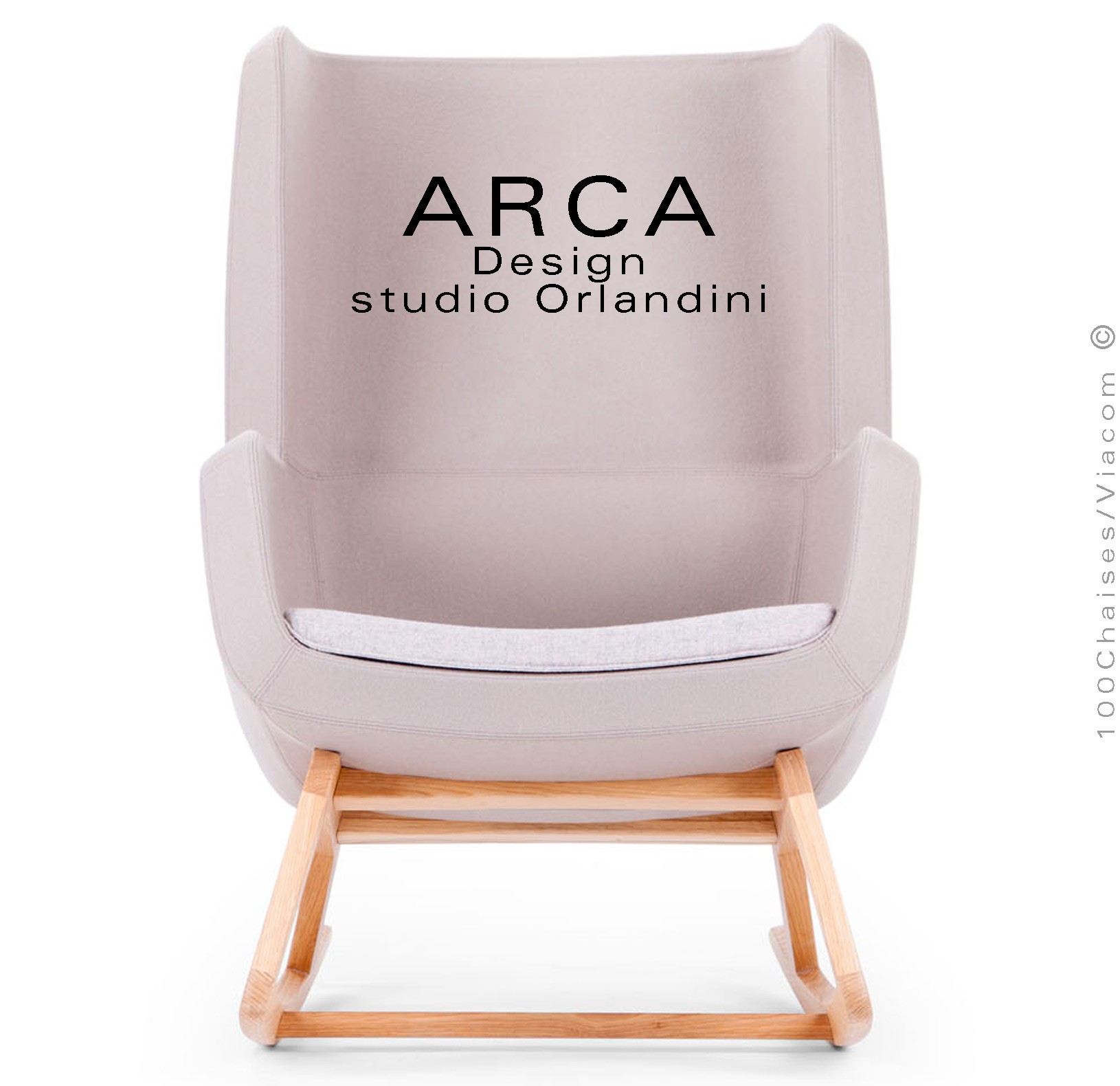 Fauteuil à bascule rocking chair lounge ARCA, structure interne en acier associée à un rembourrage en mousse moulée et injectée à froid. Piétement et structure 4 pieds en bois massif de Frêne, patins ou skis courbe et légèrement conique, extrémités arrondies, finition vernis naturel ou peint (autre sur demande voir palette fabricant). Assise et dossier haut avec accoudoirs, habillage tissu tissé gamme ERA du fabricant Camira, composition 100% polyester. Flammabilité : EN 1021 - 1 (cigarette) - EN 1021 - 2 (allumette).