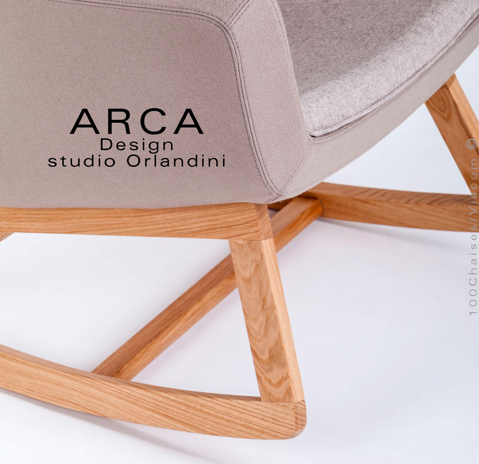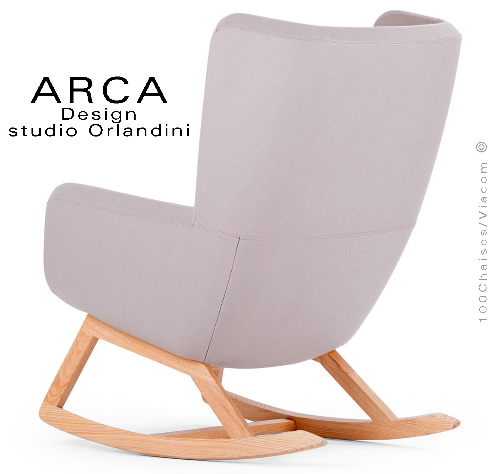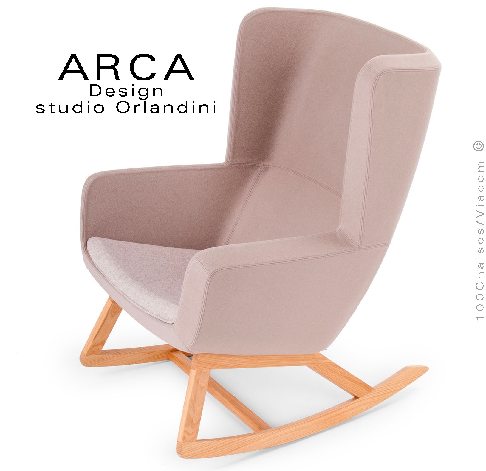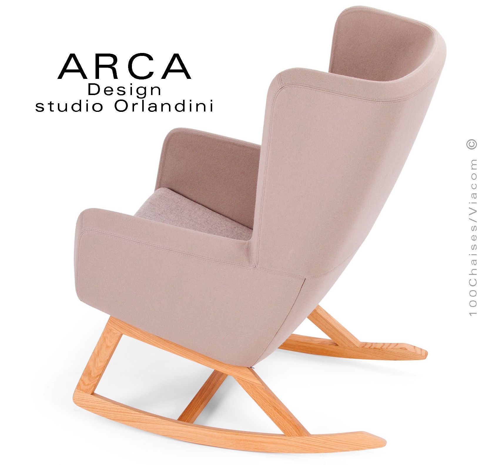 Fauteuil à bascule rocking chair lounge ARCA, structure interne en acier associée à un rembourrage en mousse moulée et injectée à froid. Piétement et structure 4 pieds en bois massif de Frêne, patins ou skis courbe et légèrement conique, extrémités arrondies, finition vernis naturel ou peint (autre sur demande voir palette fabricant). Assise et dossier haut avec accoudoirs, habillage tissu tissé gamme ERA du fabricant Camira, composition 100% polyester. Flammabilité : EN 1021 - 1 (cigarette) - EN 1021 - 2 (allumette).