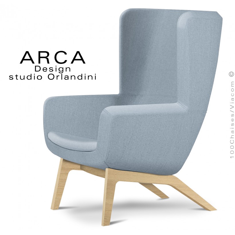 Fauteuil lounge confort ARCA, pour salon d'attente standing, habillage tissu couleur bleu clair, piétement bois naturel.