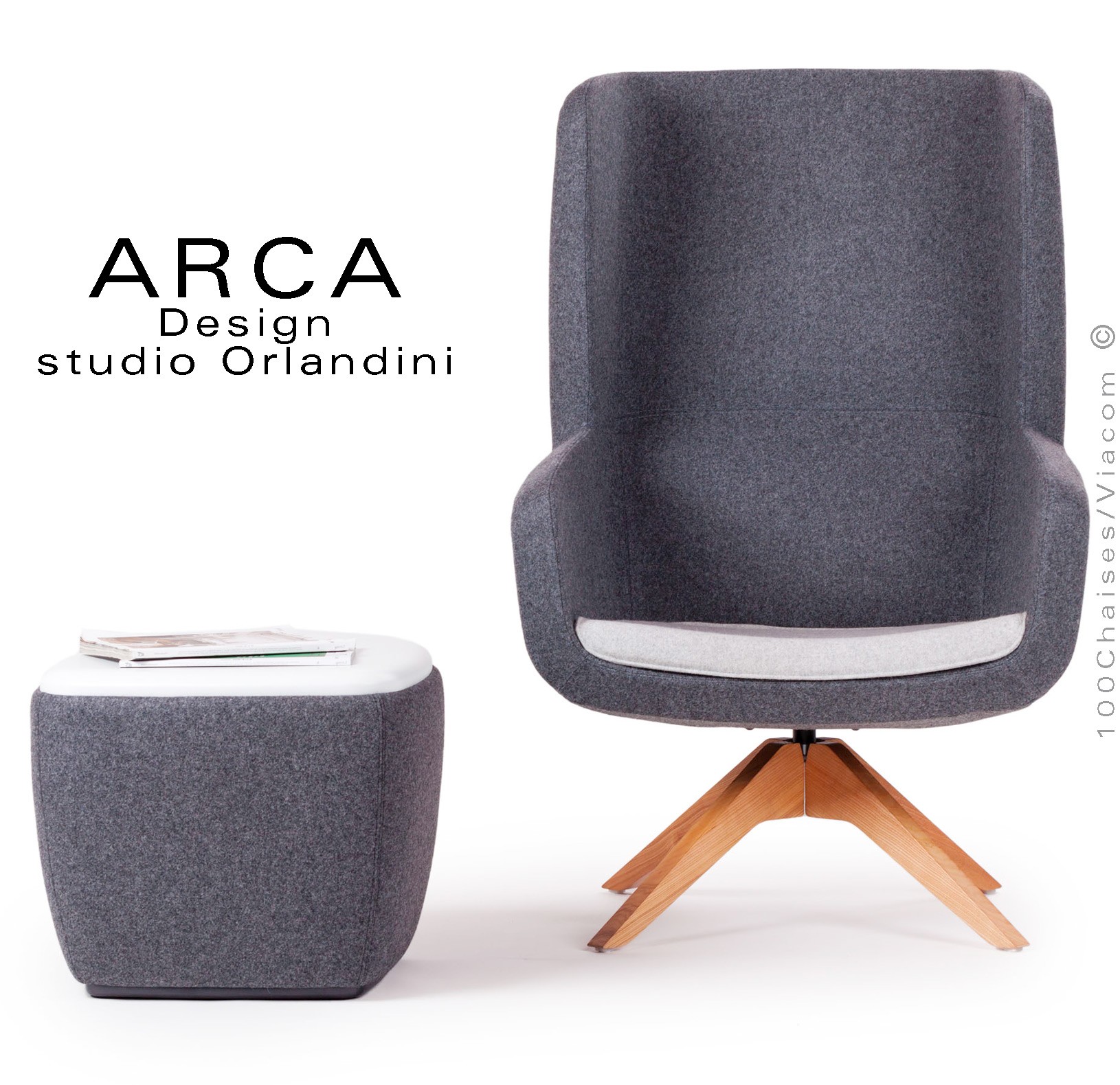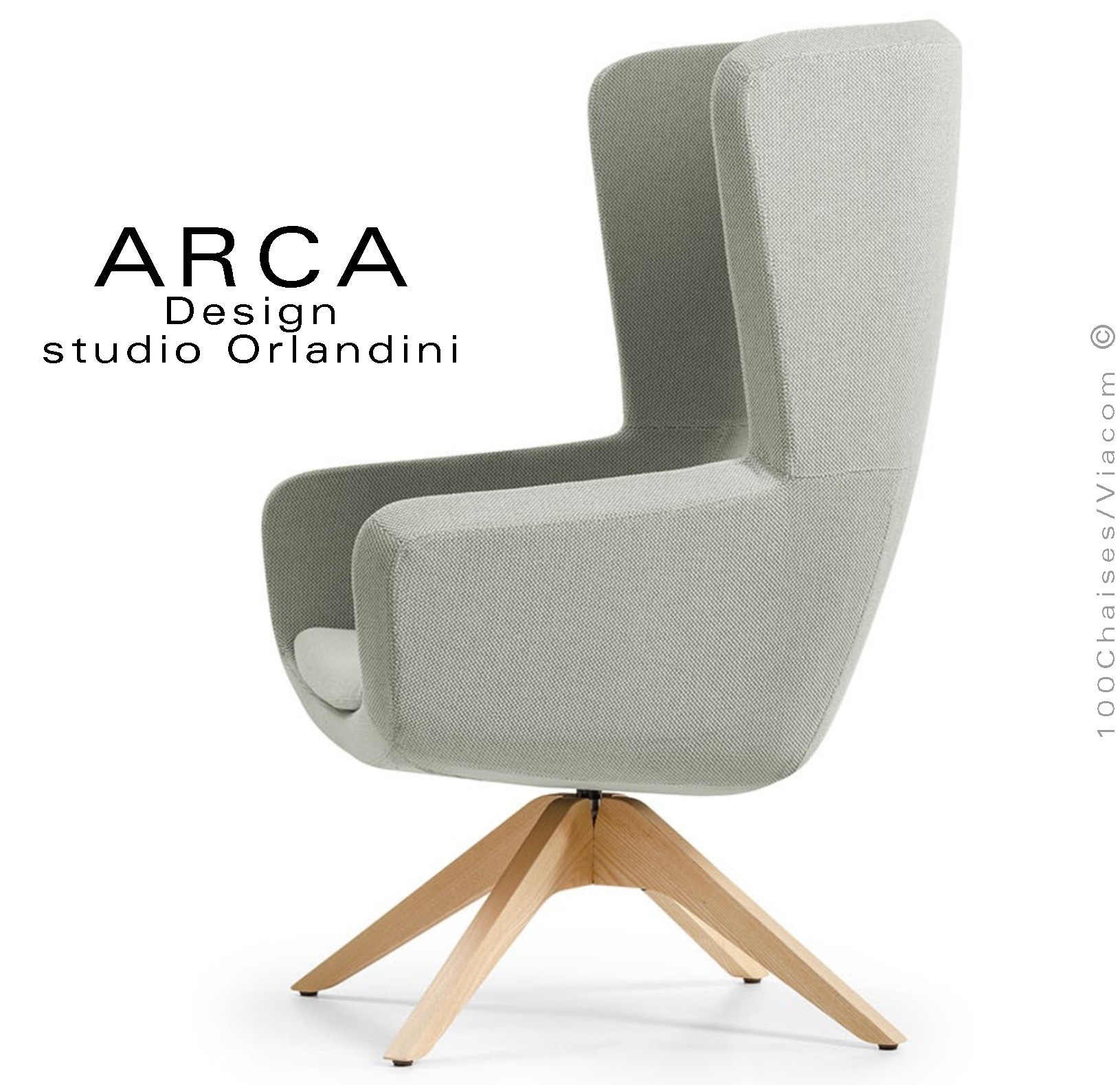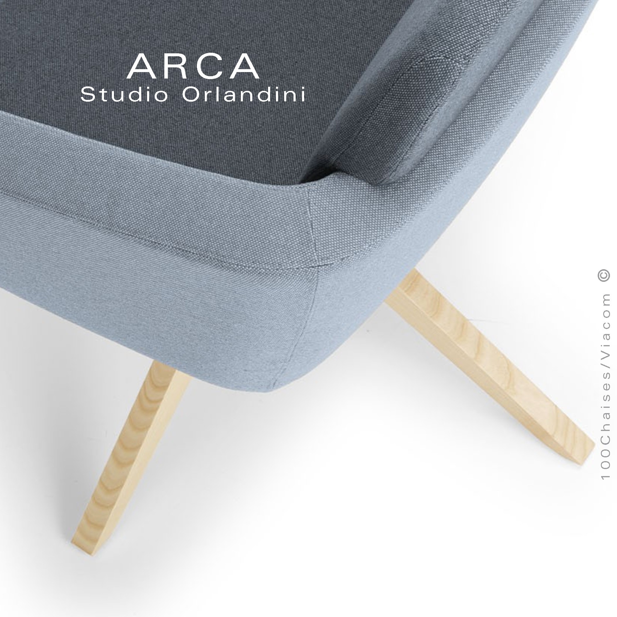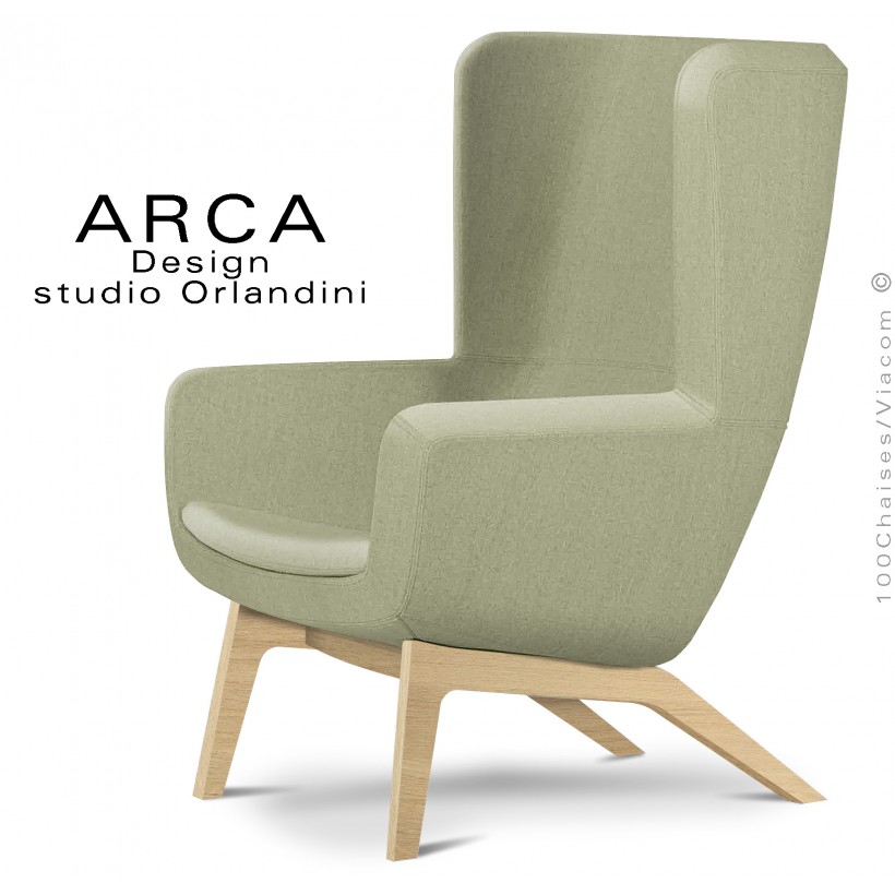 Fauteuil lounge pour salon d'attente standing ARCA, structure interne en acier associée à un rembourrage en mousse moulée et injectée à froid. Dossier haut. Piétement à quatre branches en bois massif de Frêne, finition vernis naturel ou peint (autre sur demande voir palette peinture). Piétement avec tampons plastiques de protection des sols. Habillage tissu tissé gamme ERA du fabricant Camira, composition 100% polyester. Flammabilité : EN 1021 - 1 (cigarette) - EN 1021 - 2 (allumette).