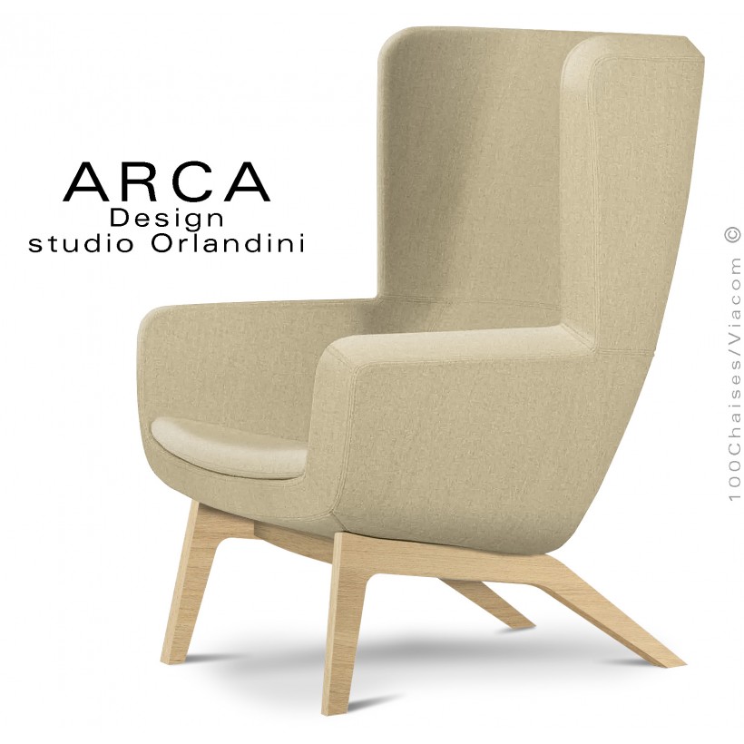 Fauteuil lounge confort ARCA, pour salon d'attente standing, habillage tissu 100% polyester, piétement bois de Frêne massif.