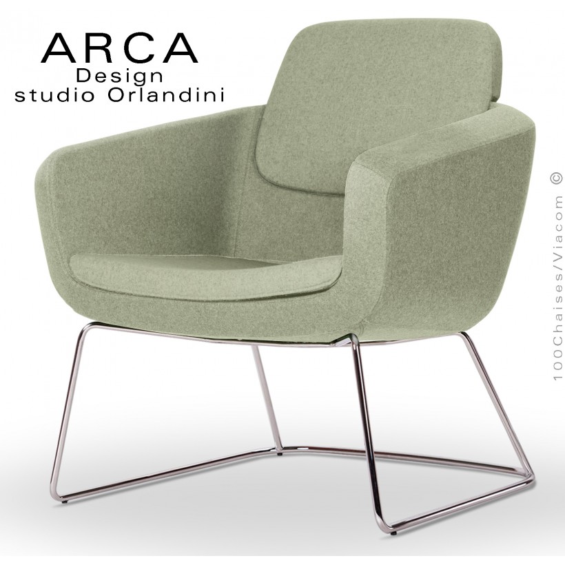 Fauteuil lounge confort ARCA, pour salon d'attente standing, habillage tissu couleur vert clair, piétement luge chromé.