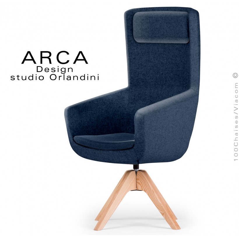 Fauteuil de travail ou salle de réunion ARCA Small, structure interne en acier associée à un rembourrage en mousse moulée et injectée à froid. Dossier haut avec appui-tête. Piétement à quatre branches en bois massif de Frêne, finition vernis naturel ou peint (autre sur demande voir palette peinture). Piétement avec tampons plastiques de protection des sols. Fauteuil pivotant à 360°, avec système de retour automatique. Habillage tissu gamme Focus Mélange du fabricant Gabriel, composition 100% laine Nouvelle-Zélande. Flammabilité : AM 18 - NF D 60-013-(only for fabric).