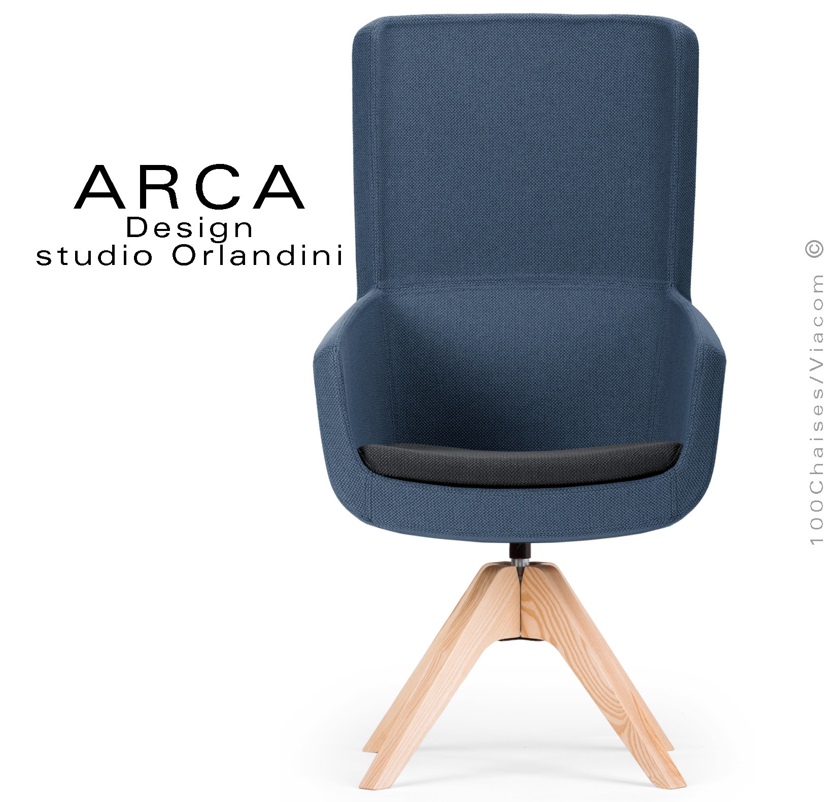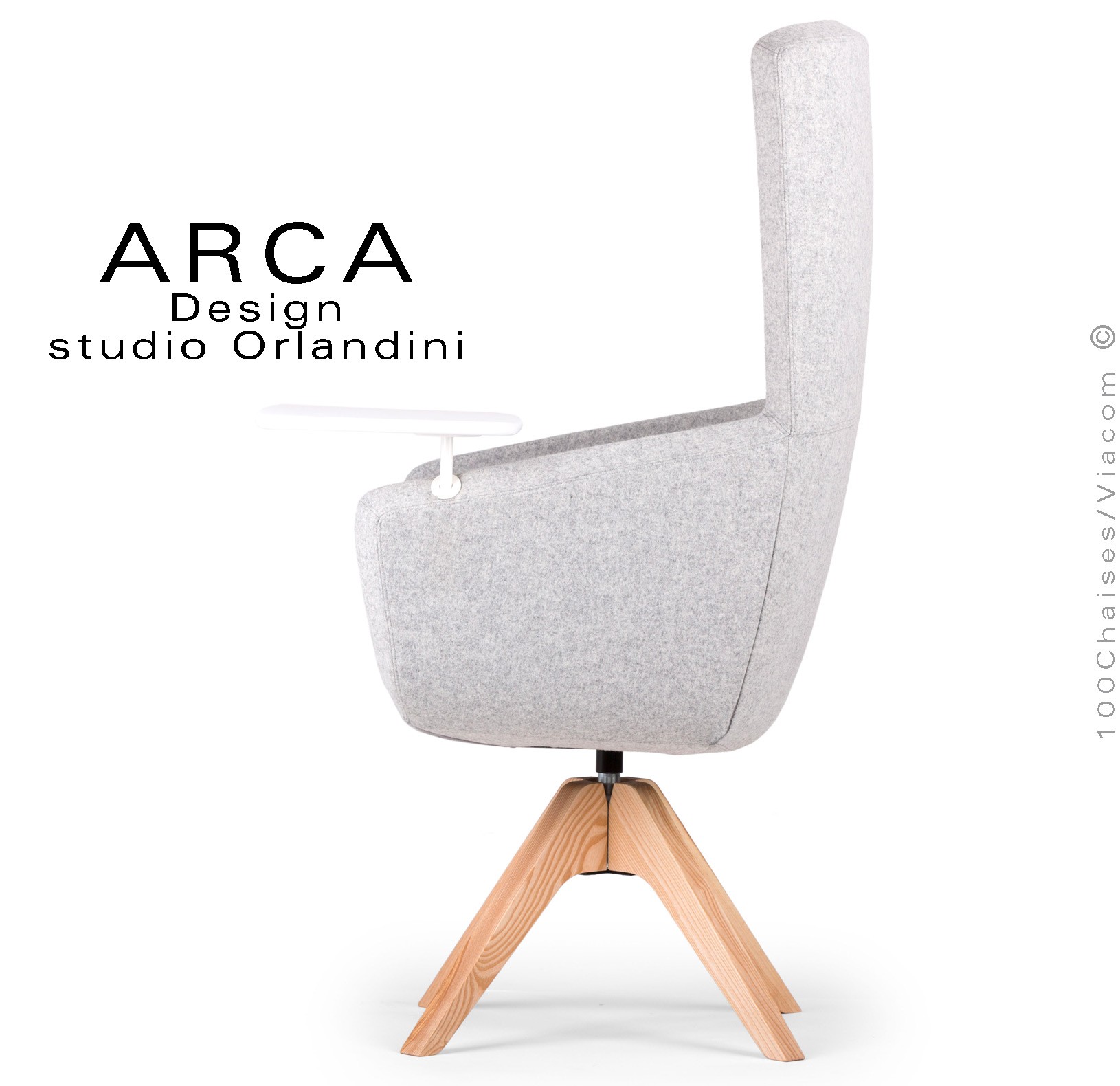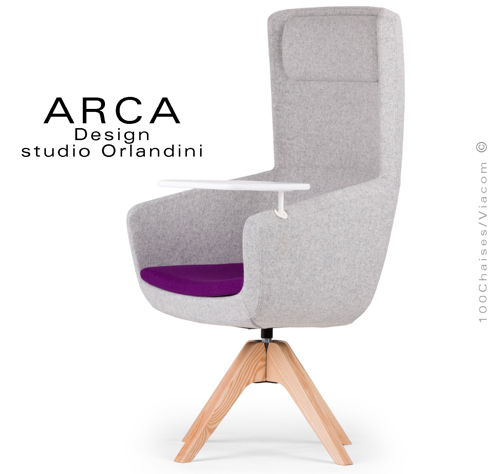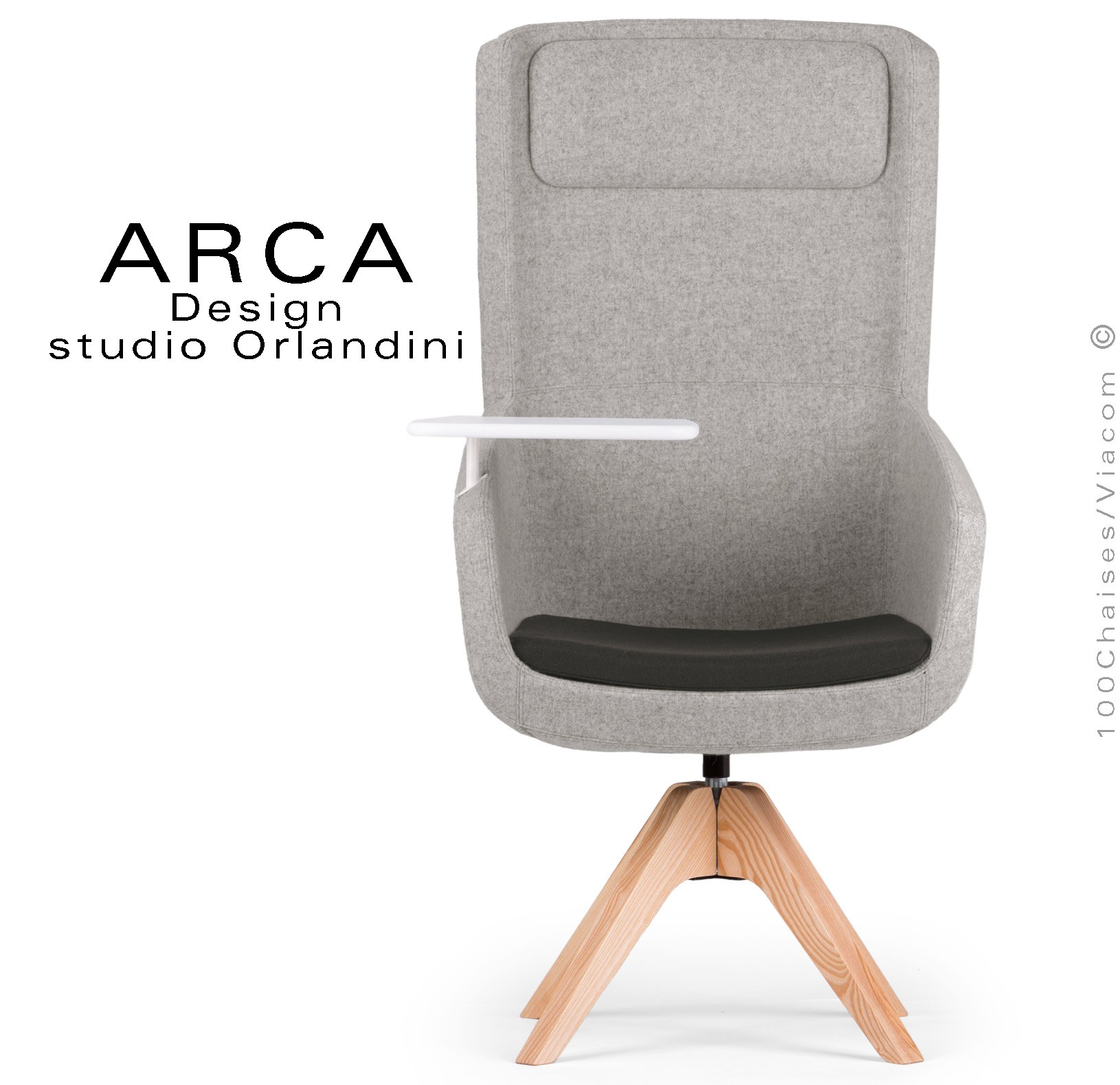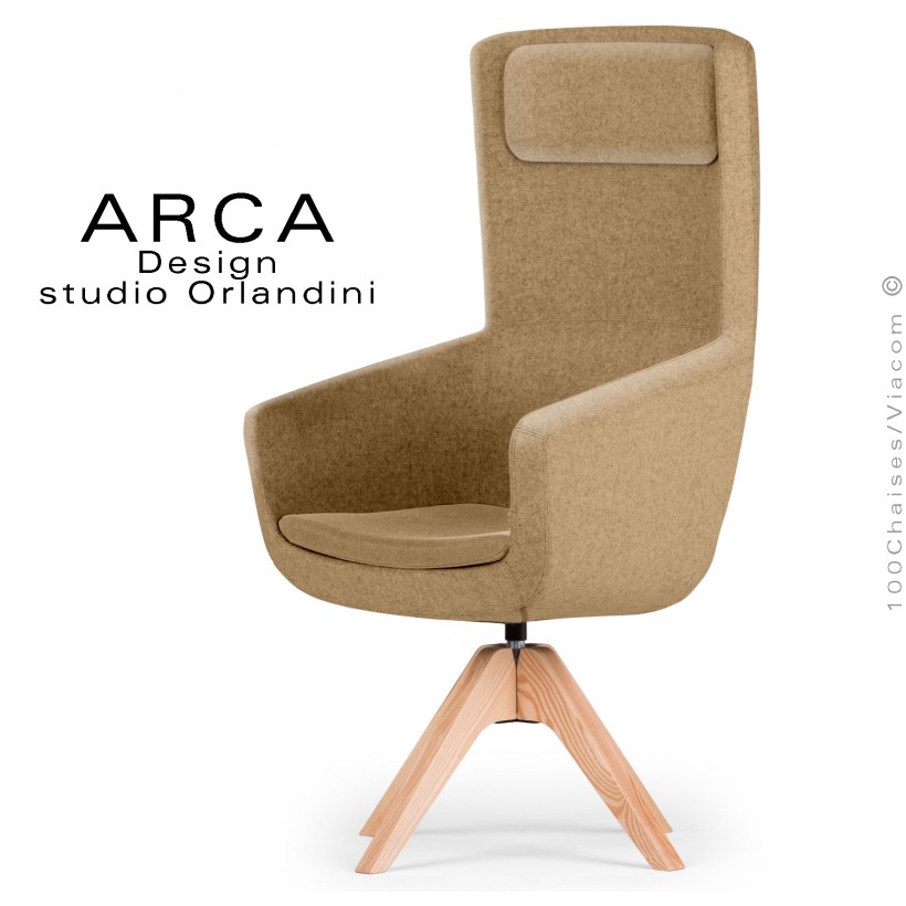 Fauteuil de travail ou salle de réunion ARCA Small, structure interne en acier associée à un rembourrage en mousse moulée et injectée à froid. Dossier haut avec appui-tête. Piétement à quatre branches en bois massif de Frêne, finition vernis naturel ou peint (autre sur demande voir palette peinture). Piétement avec tampons plastiques de protection des sols. Fauteuil pivotant à 360°, avec système de retour automatique. Habillage tissu gamme Focus Mélange du fabricant Gabriel, composition 100% laine Nouvelle-Zélande. Flammabilité : AM 18 - NF D 60-013-(only for fabric).