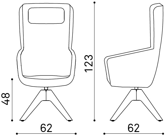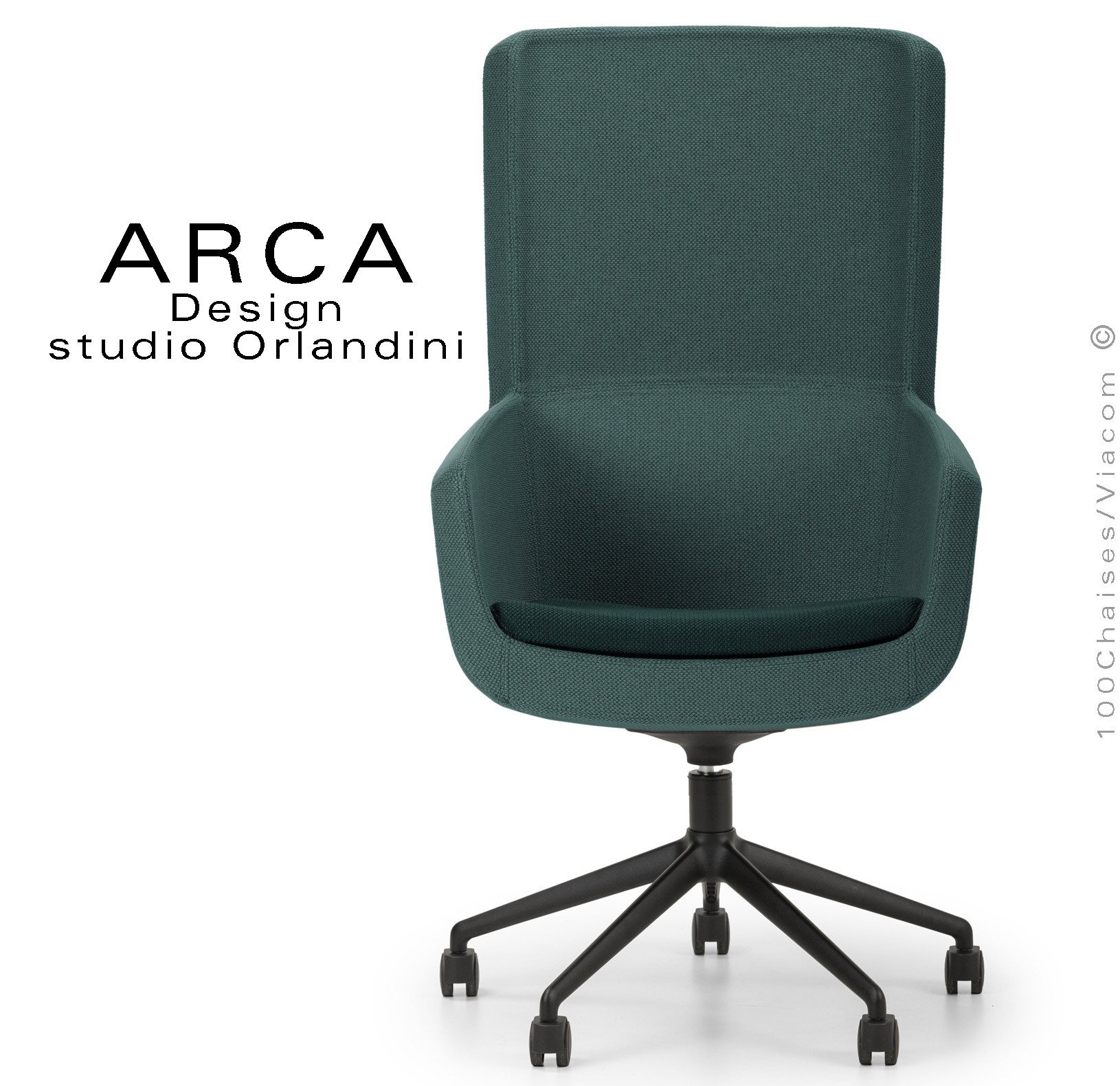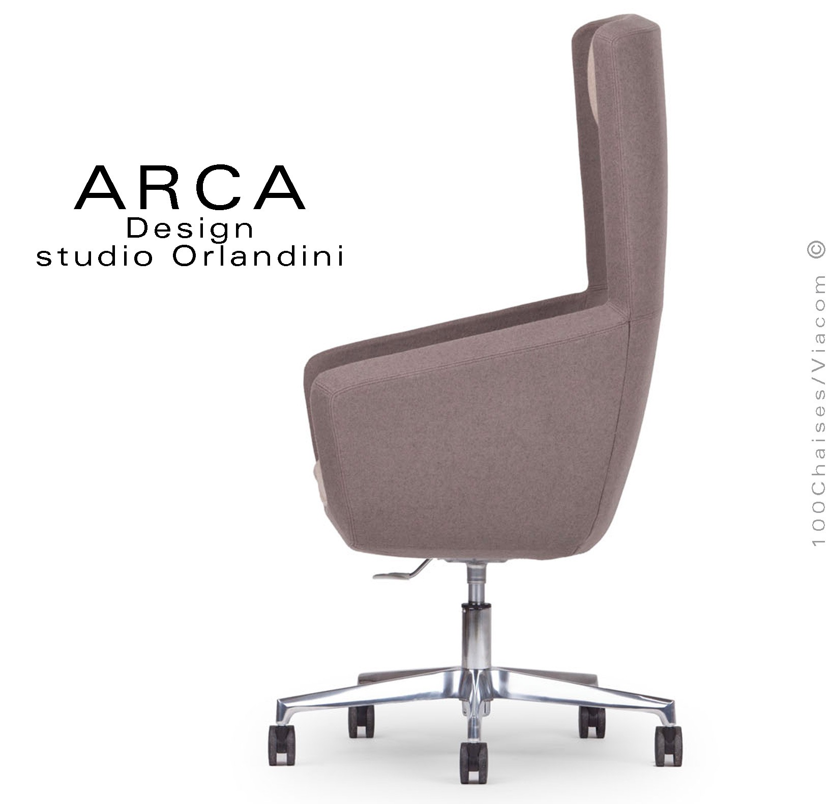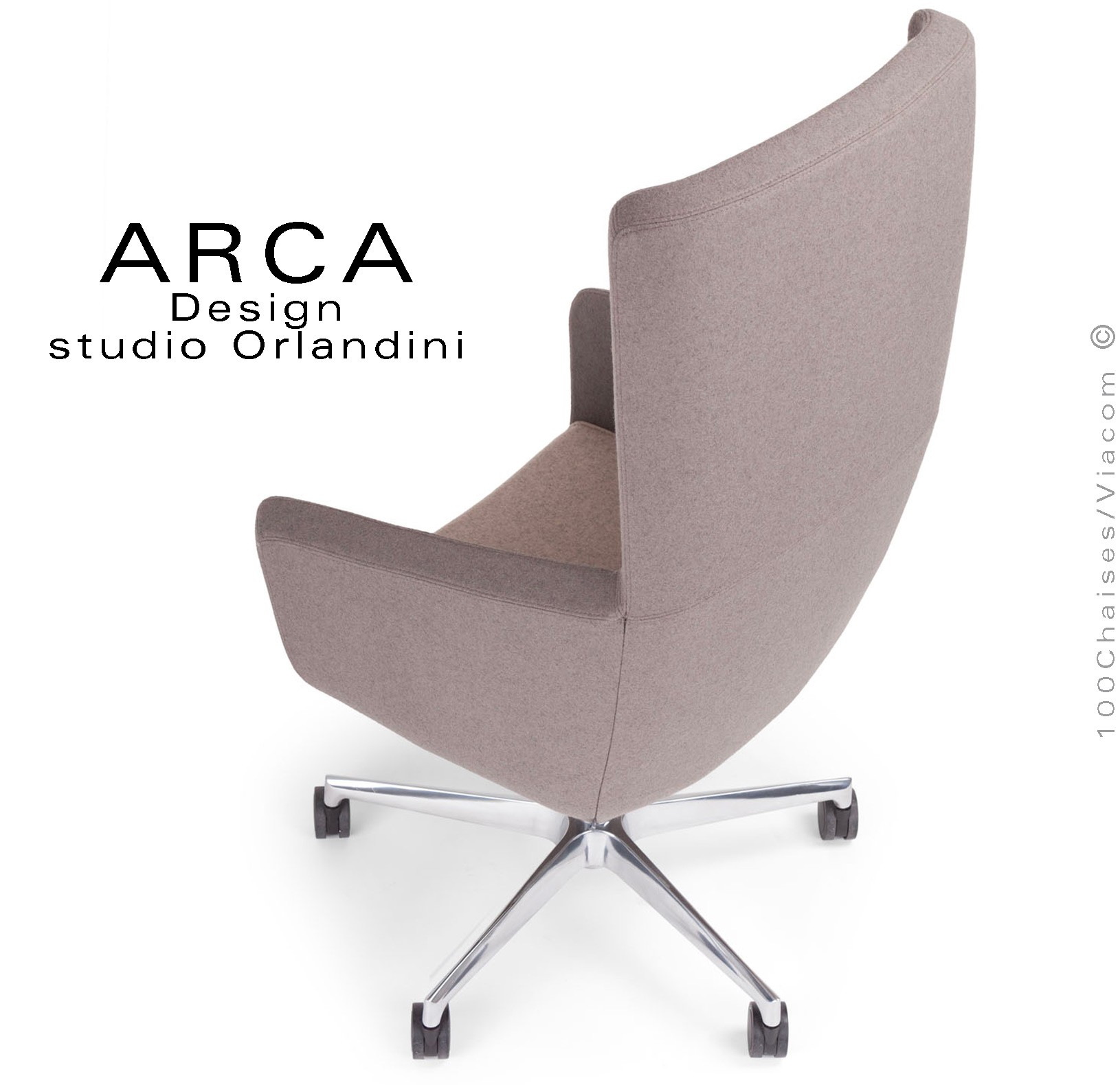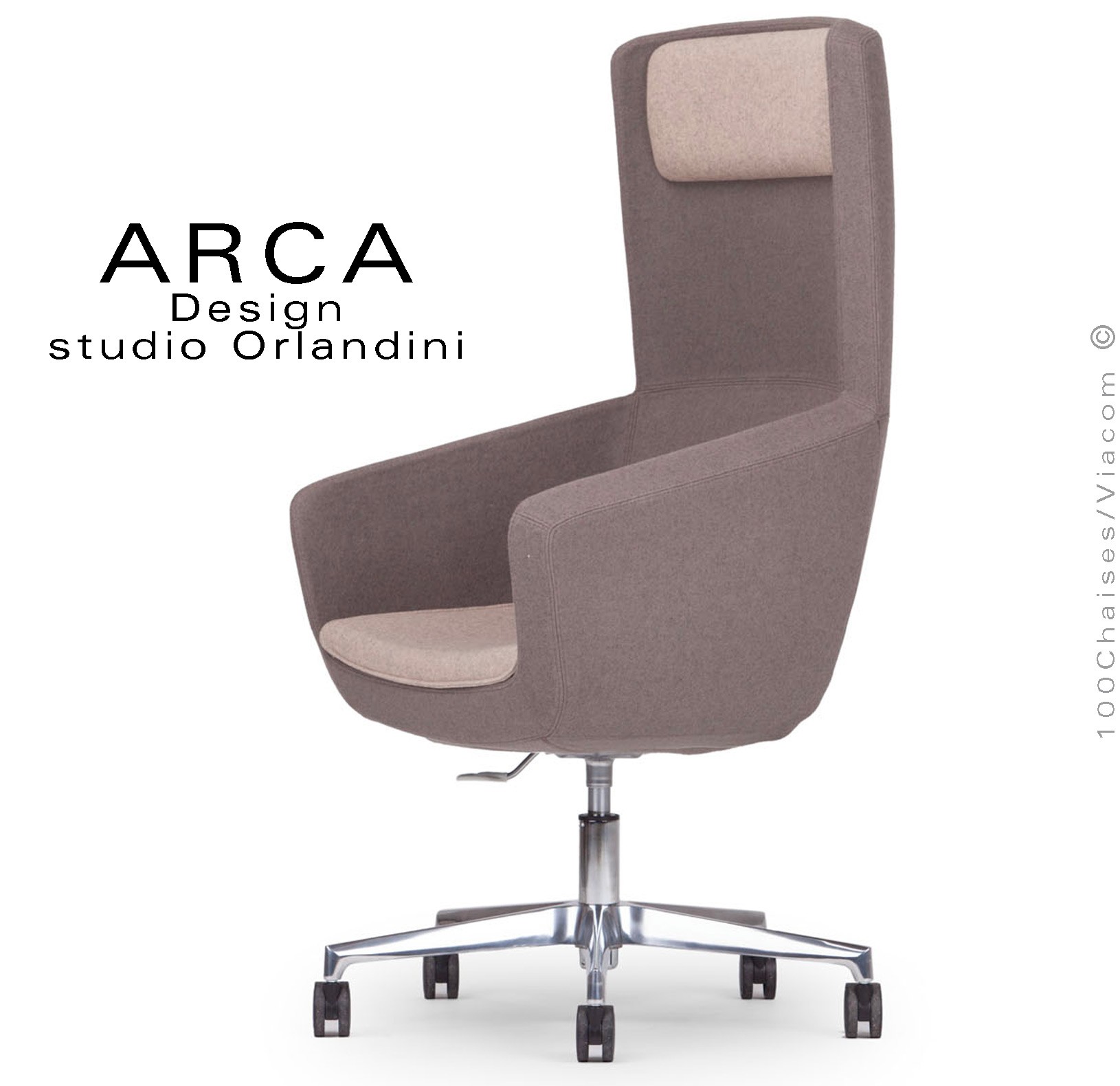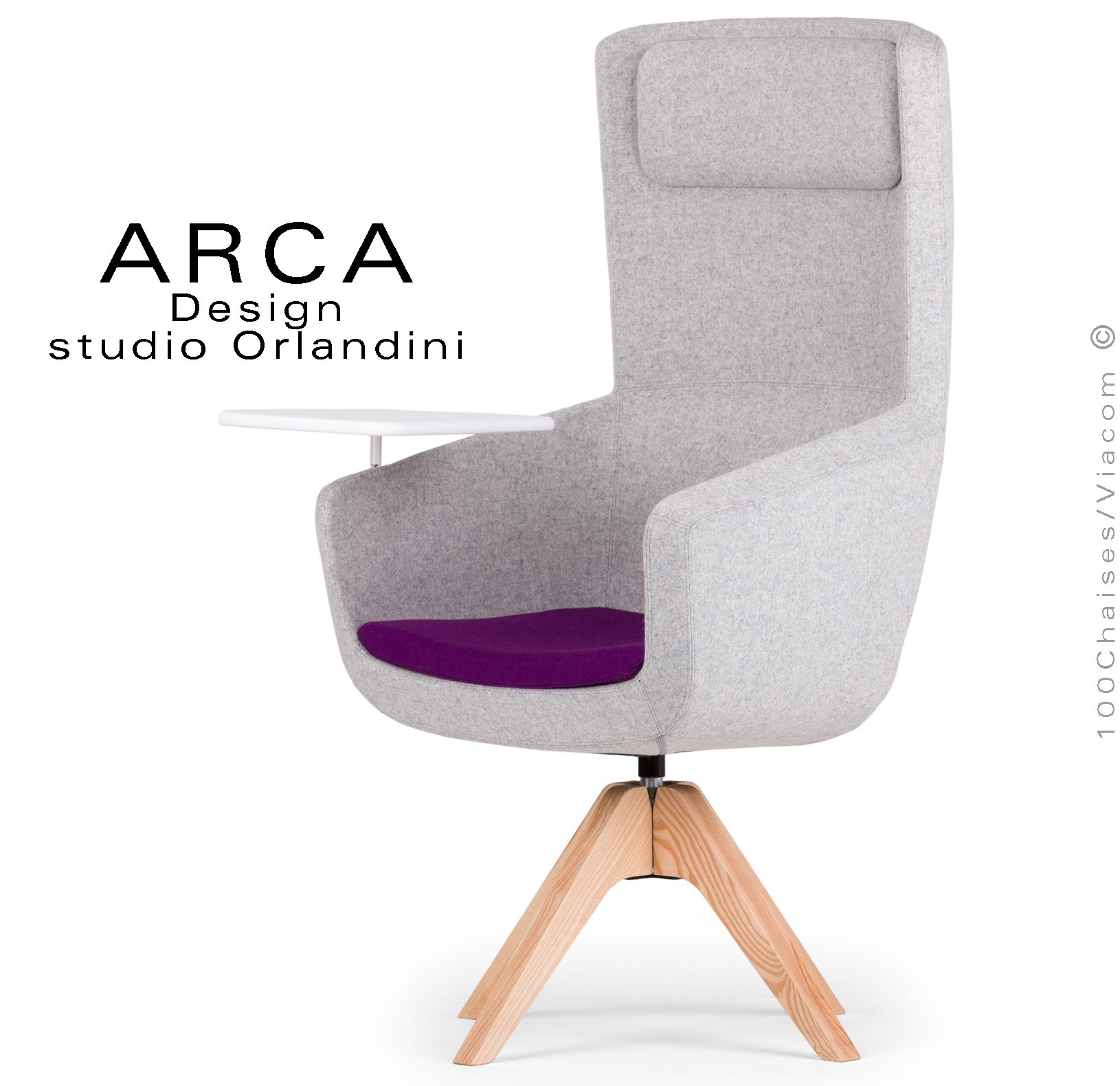 Fauteuil de travail ou salle de réunion ARCA Small, structure interne en acier associée à un rembourrage en mousse moulée et injectée à froid. Dossier haut avec appui-tête. Piétement à quatre branches en bois massif de Frêne, finition vernis naturel ou peint (autre sur demande voir palette peinture). Piétement avec tampons plastiques de protection des sols. Fauteuil pivotant à 360°, avec système de retour automatique. Habillage tissu gamme Focus Mélange du fabricant Gabriel, composition 100% laine Nouvelle-Zélande. Flammabilité : AM 18 - NF D 60-013-(only for fabric).