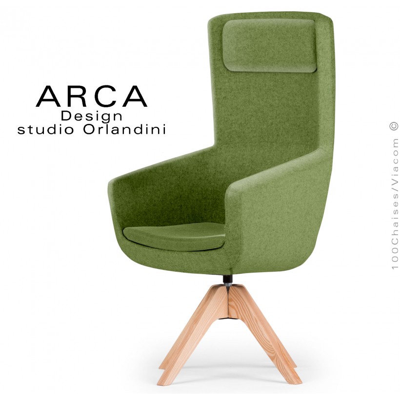 Fauteuil de travail ou salle de réunion ARCA Small, structure interne en acier associée à un rembourrage en mousse moulée et injectée à froid. Dossier haut avec appui-tête. Piétement à quatre branches en bois massif de Frêne, finition vernis naturel ou peint (autre sur demande voir palette peinture). Piétement avec tampons plastiques de protection des sols. Fauteuil pivotant à 360°, avec système de retour automatique. Habillage tissu gamme Focus Mélange du fabricant Gabriel, composition 100% laine Nouvelle-Zélande. Flammabilité : AM 18 - NF D 60-013-(only for fabric).