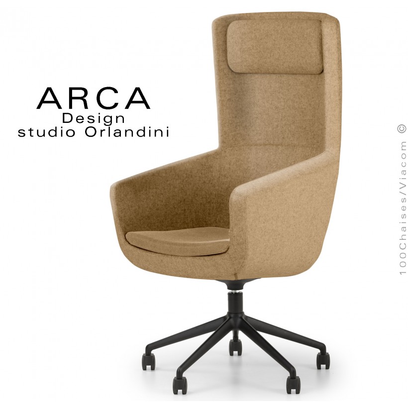 Fauteuil de travail, bureau ou salle de réunion ARCA Small, structure interne en acier associée à un rembourrage en mousse moulée et injectée à froid. Dossier haut avec appui-tête. Piétement à cinq branches en aluminium, avec roulettes, finition peinture noir. Fauteuil pivotant à 360°. Habillage assise tissu gamme Focus Mélange du fabricant Gabriel, composition 100% laine Nouvelle-Zélande. Flammabilité : AM 18 - NF D 60-013-(only for fabric).