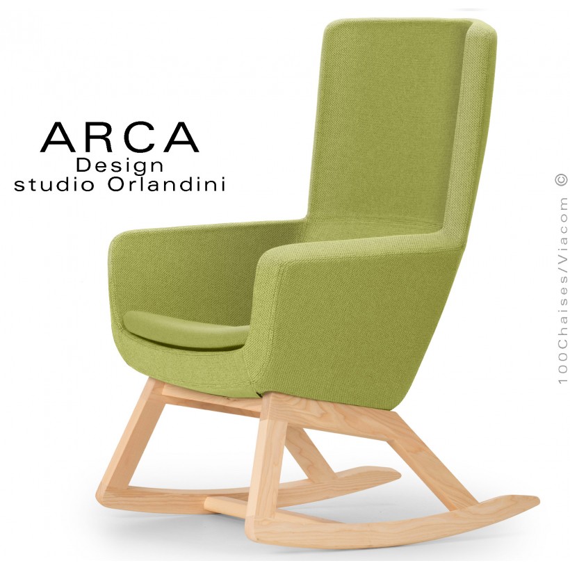 Fauteuil à bascule rocking chair ARCA Small, le confort pour la maison, tissu couleur vert pistache, piétement bois massif.