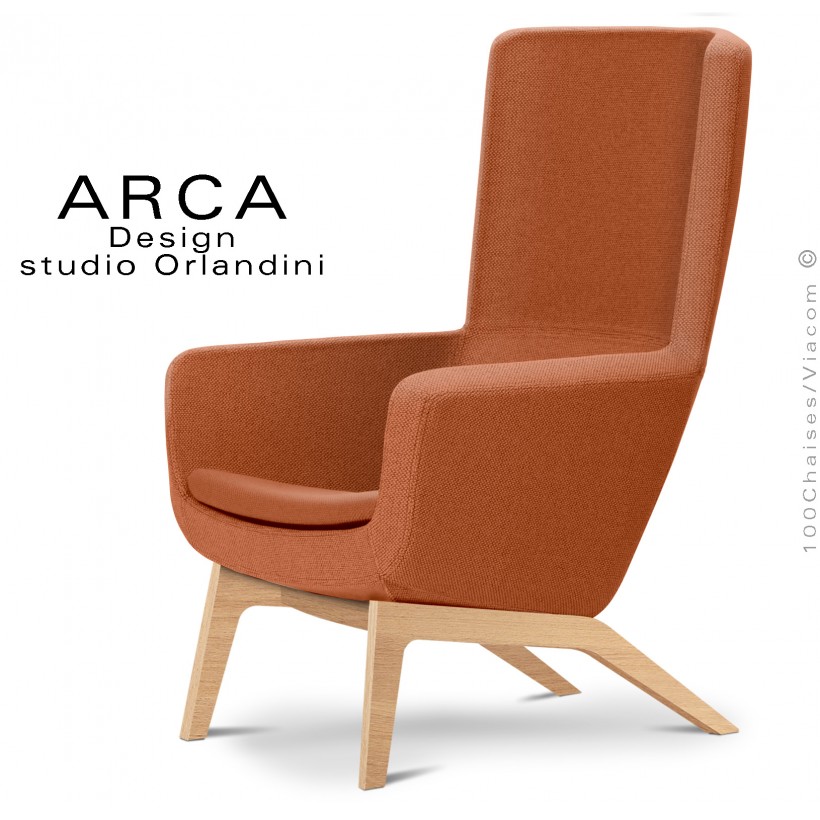 Fauteuil confort ARCA Small, pour salon d'attente standing, tissu 100% polyester orange, piétement bois de Frêne.