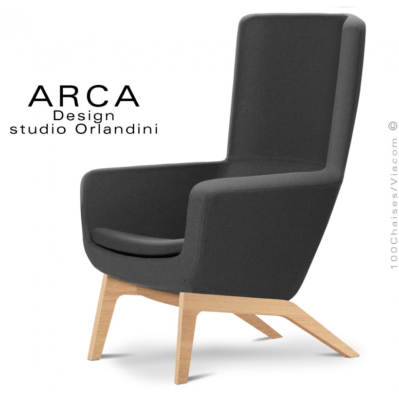 Fauteuil confort ARCA Small, pour salon d'attente standing, habillage tissu 100% polyester, piétement bois de Frêne massif.