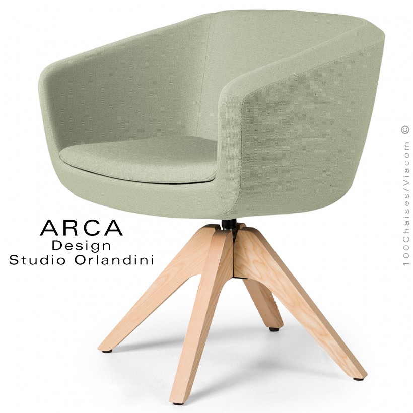 Fauteuil confort pivotant ARCA Small, pour bureau ou domestique, assise tissu couleur vert clair, piétement bois.