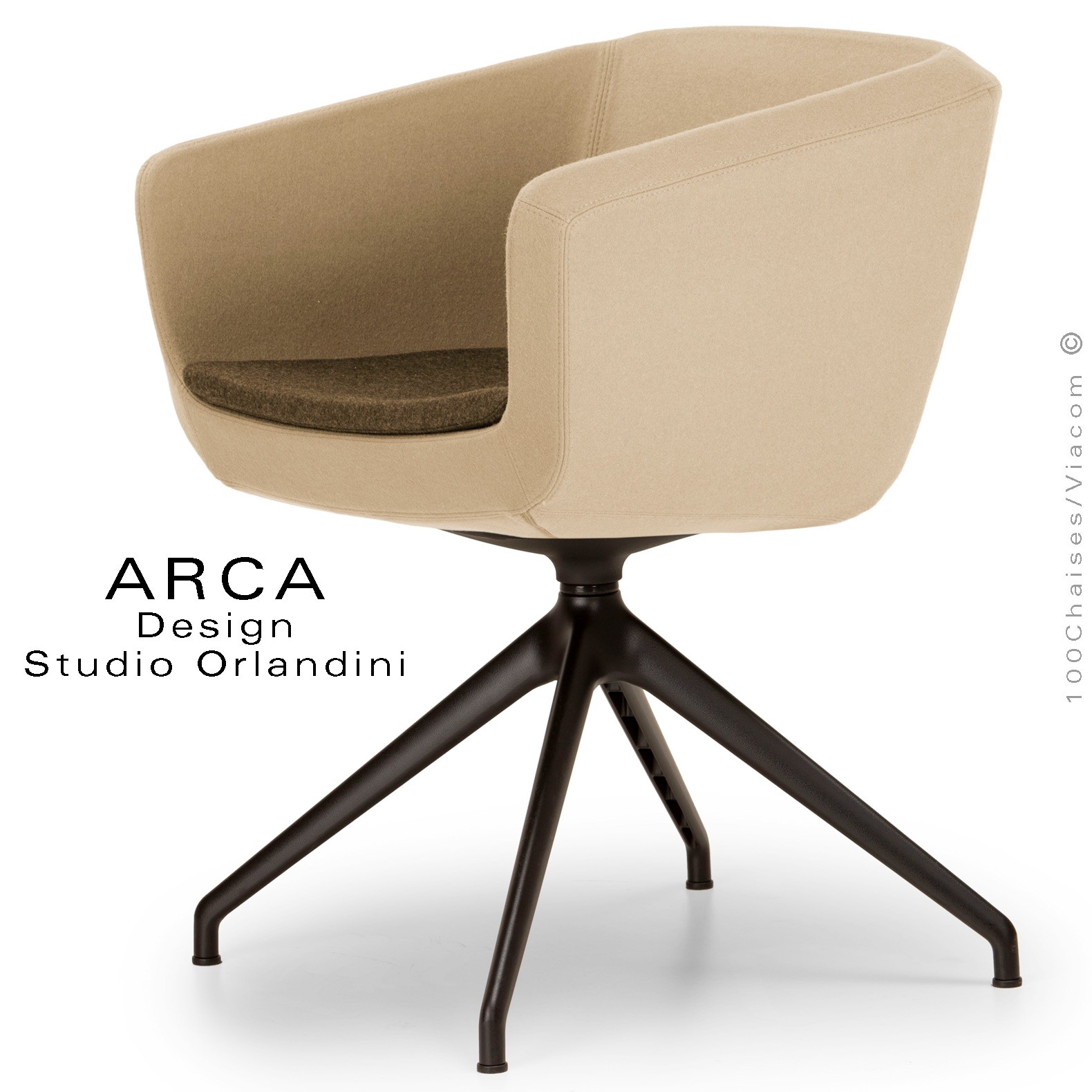 Fauteuil de bureau ou domestique pivotant ARCA Small, structure interne en acier. Assise, dossier et accoudoirs garnis de mousse moulée et injectée à froid. Habillage tissu type feutre gamme ERA, 100% polyester du fabricant Camira, couleur au choix voir gamme fabricant. Piétement 4 branches en fonte d'aluminium, finition peinture noir ou autre au choix (suivant palette fabricant). Assise pivotant 360°. Avec tampons plastiques de protection des sols.