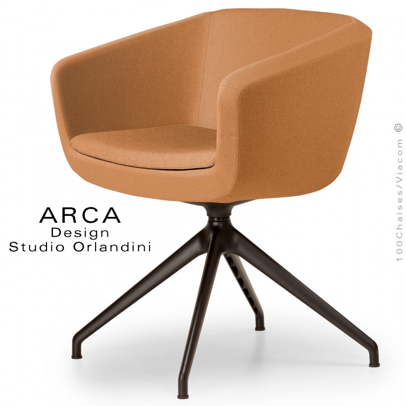 Fauteuil de bureau ou domestique pivotant ARCA Small, structure interne en acier. Assise, dossier et accoudoirs garnis de mousse moulée et injectée à froid. Habillage tissu type feutre gamme ERA, 100% polyester du fabricant Camira, couleur au choix voir gamme fabricant. Piétement 4 branches en fonte d'aluminium, finition peinture noir ou autre au choix (suivant palette fabricant). Assise pivotant 360°. Avec tampons plastiques de protection des sols.