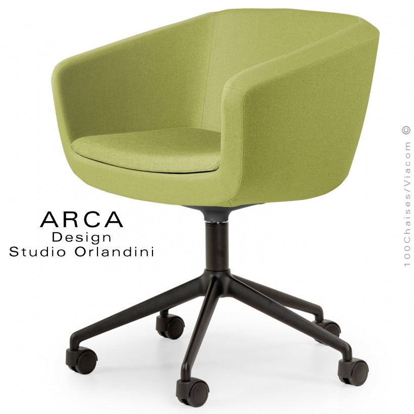 Fauteuil de bureau ARCA Small, assise garnie, habillage tissu couleur vert, piétement aluminium noir, avec roulettes.