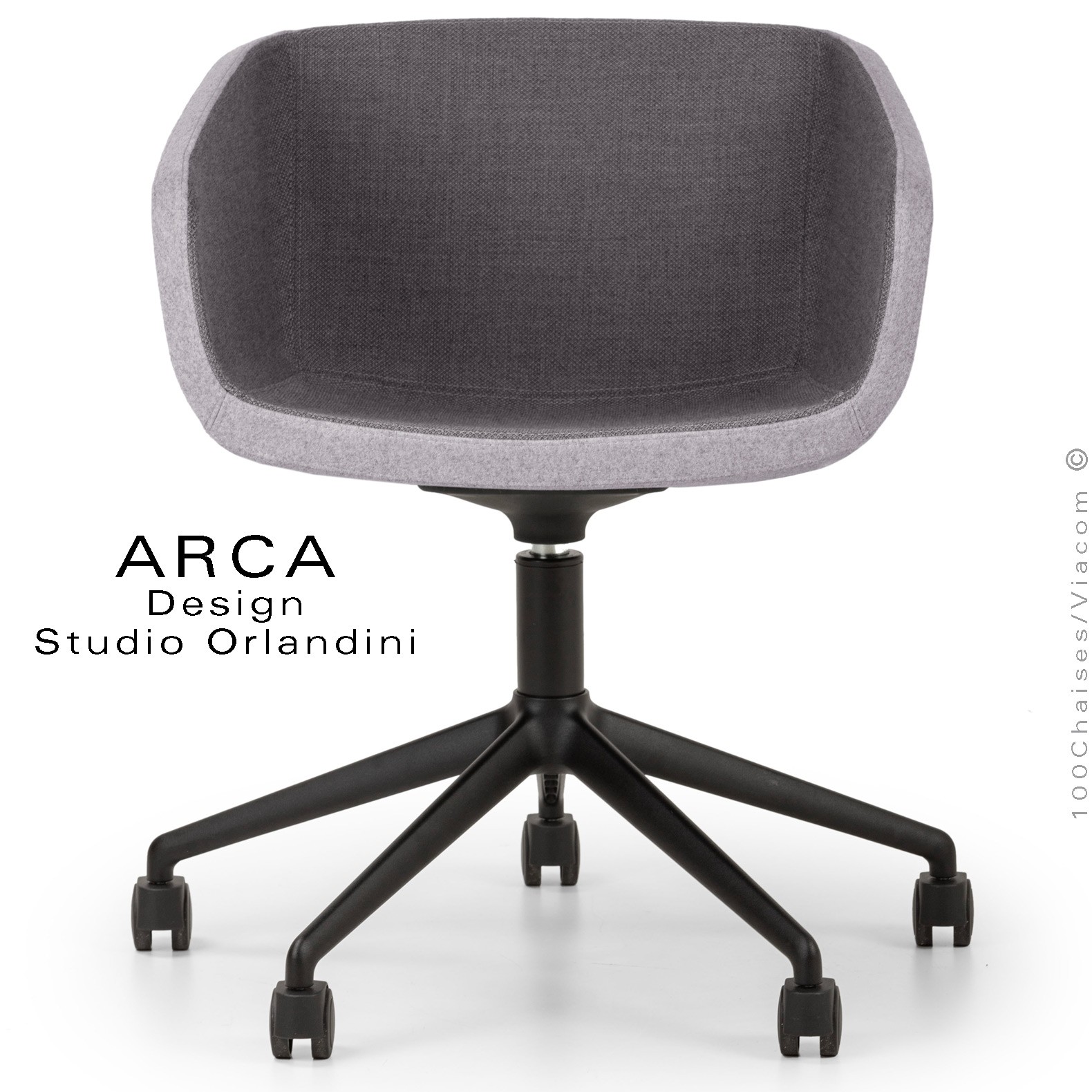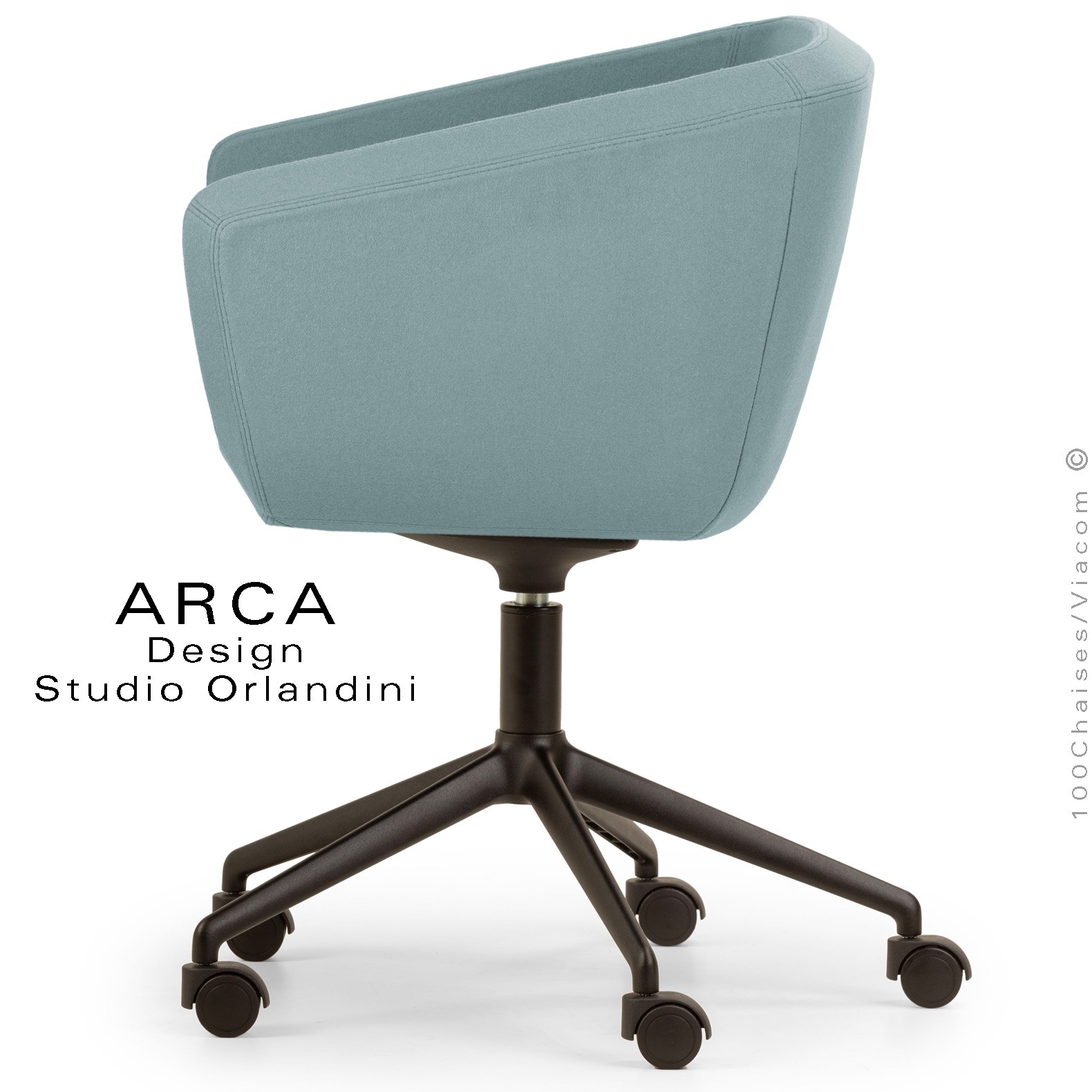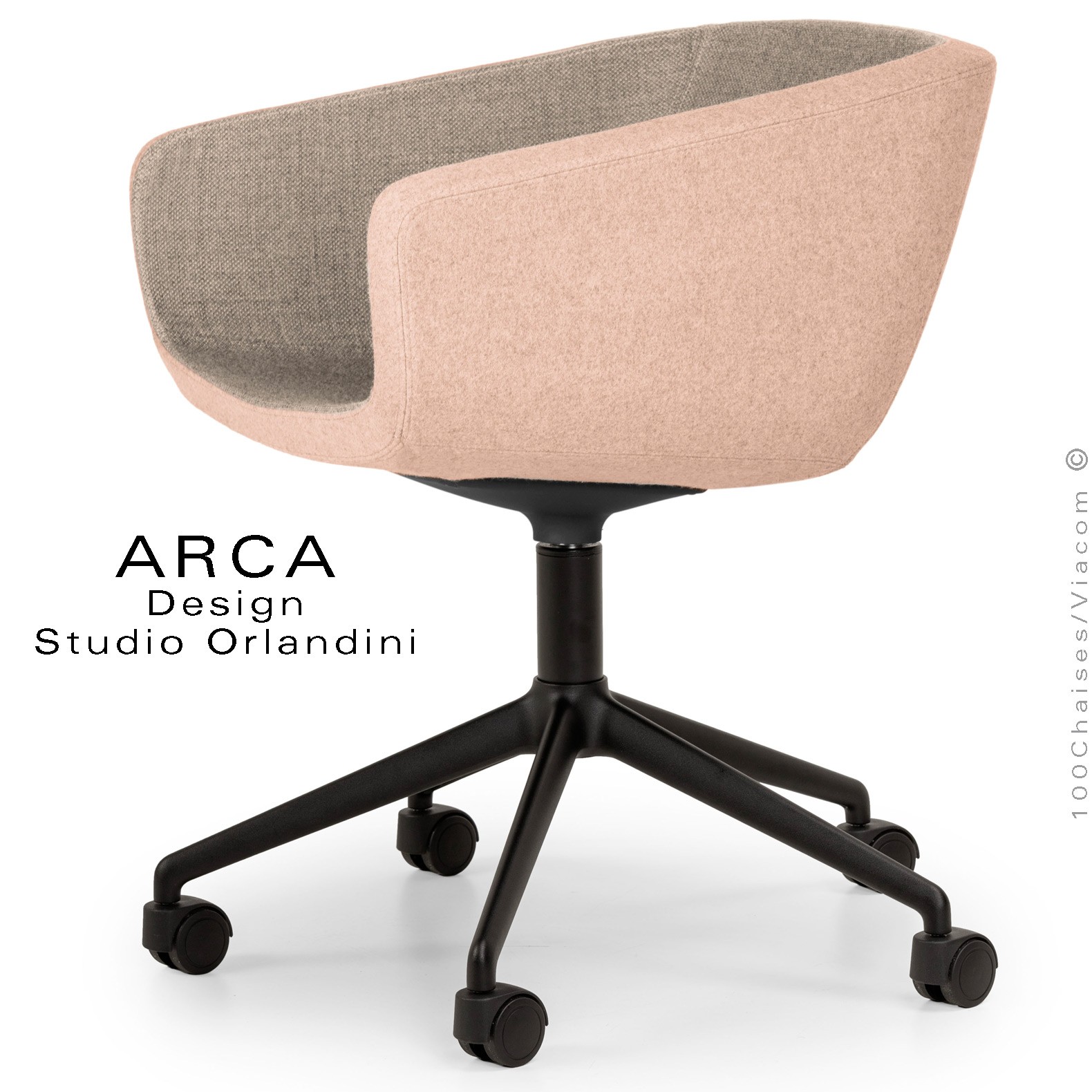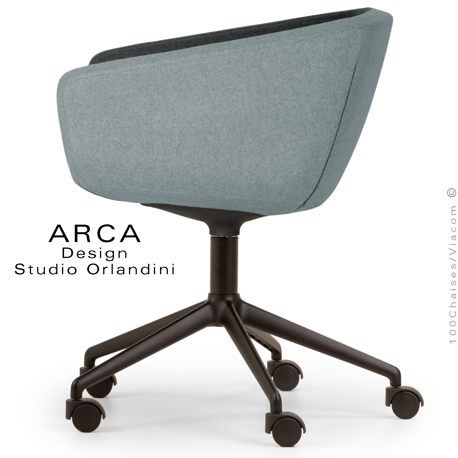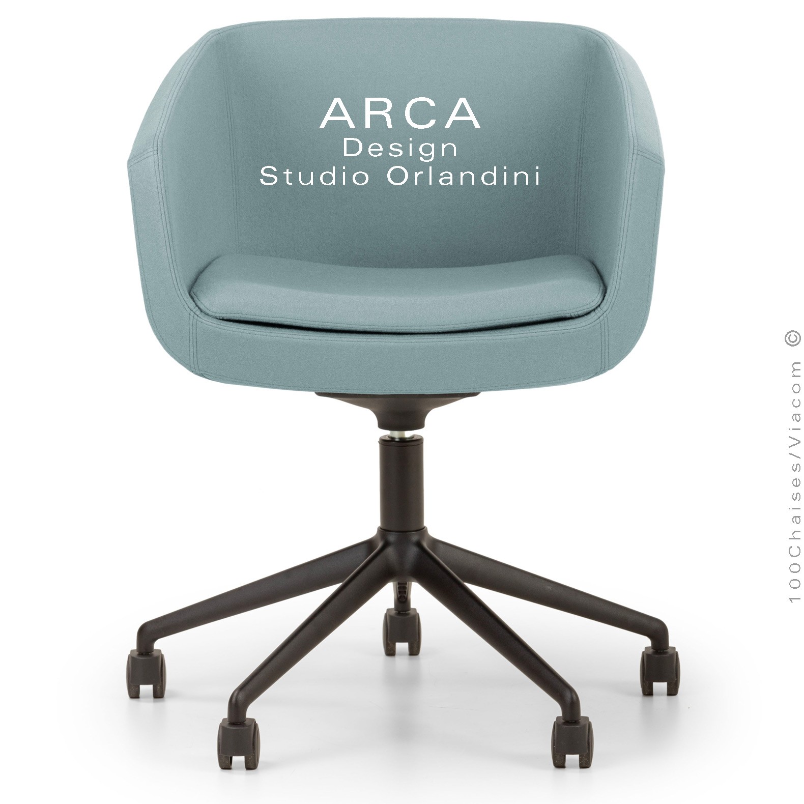 Fauteuil de bureau ou domestique pivotant avec roulettes ARCA Small, structure interne en acier. Assise, dossier et accoudoirs garnis de mousse moulée et injectée à froid. Habillage tissu type feutre gamme ERA, 100% polyester du fabricant Camira, couleur au choix voir gamme fabricant. Assise avec élévation sur vérin à gaz et pivotante à 360°. Piétement cinq branches en fonte d'aluminium avec roulettes plastiques,  finition peinture noir ou autre au choix (suivant palette fabricant).