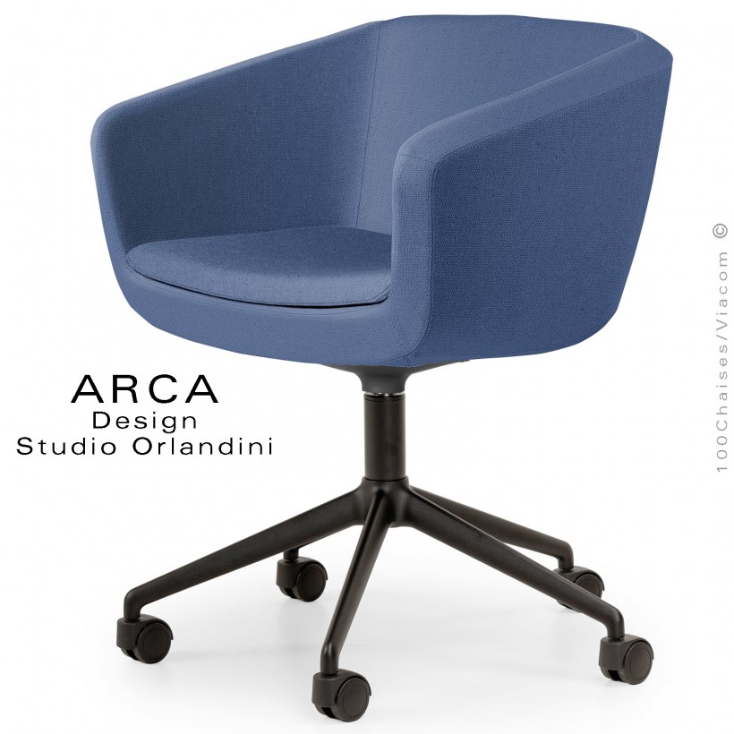 Fauteuil de bureau ARCA Small, assise garnie, habillage tissu couleur bleu, piétement aluminium noir, avec roulettes.