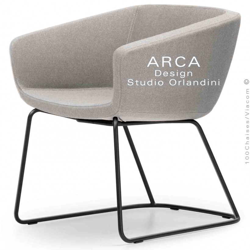 Fauteuil d'attente ou domestique ARCA Mini, structure interne en acier. Assise, dossier et accoudoirs garnis de mousse moulée et injectée à froid. Habillage tissu type feutre gamme ERA, 100% polyester du fabricant Camira, couleur au choix voir gamme fabricant. Piétement type luge ou traineau, en fil ou rond d'acier Ø15 mm., finition peinture noir ou autre au choix (suivant palette fabricant). Avec tampons plastiques de protection des sols.