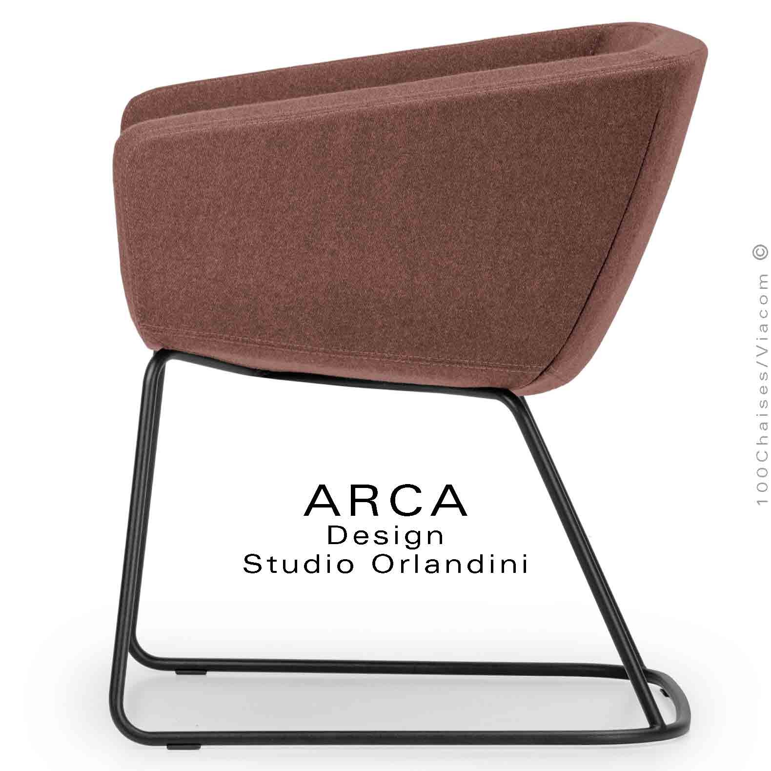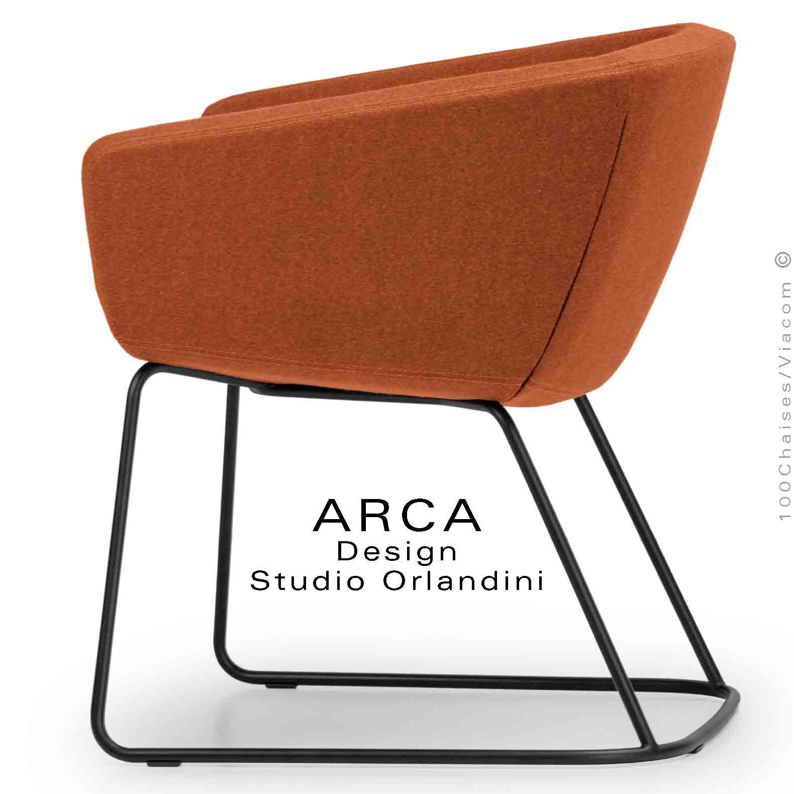 Fauteuil d'attente ou domestique ARCA Mini, structure interne en acier. Assise, dossier et accoudoirs garnis de mousse moulée et injectée à froid. Habillage tissu type feutre gamme ERA, 100% polyester du fabricant Camira, couleur au choix voir gamme fabricant. Piétement type luge ou traineau, en fil ou rond d'acier Ø15 mm., finition peinture noir ou autre au choix (suivant palette fabricant). Avec tampons plastiques de protection des sols.