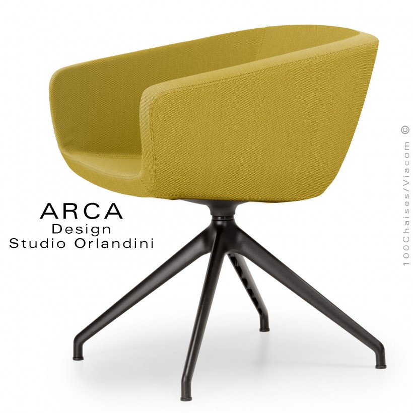 Fauteuil de bureau ARCA Mini, ou domestique, assise garnie, habillage tissu couleur jaune, piétement aluminium peint noir.