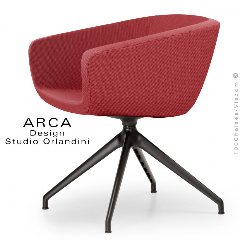 Fauteuil de bureau ARCA Mini, ou domestique, assise garnie, habillage tissu couleur rouge, piétement aluminium peint noir.