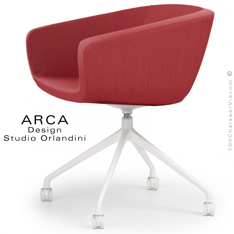 Fauteuil de bureau ARCA Mini, ou domestique, assise pivotante, habillage tissu rouge, piétement avec roulettes blanc.