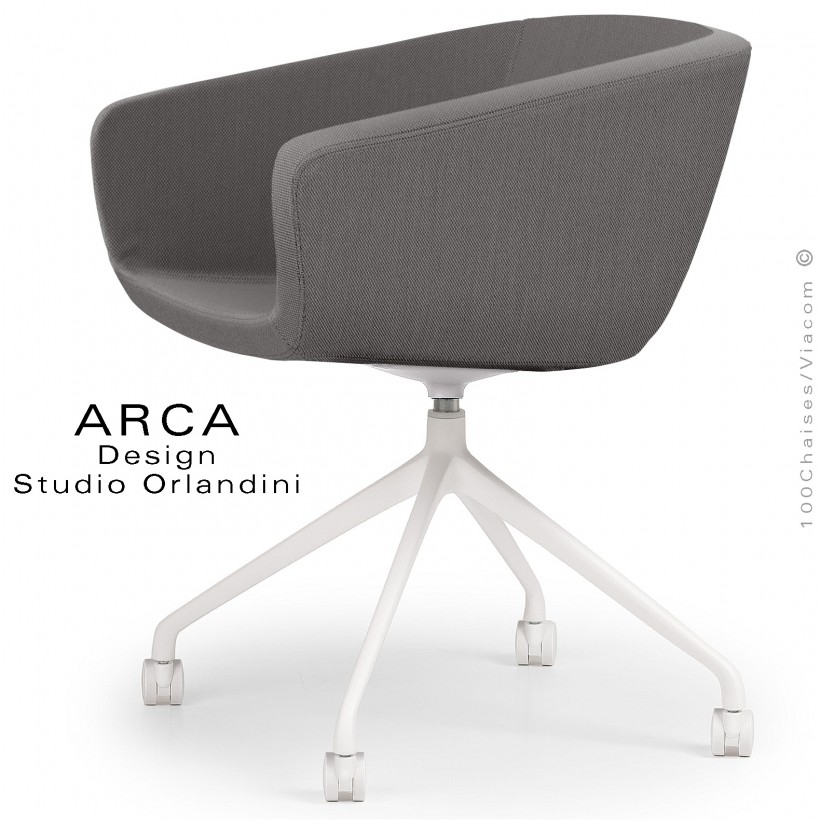 Fauteuil de bureau ARCA Mini, ou domestique, assise pivotante, habillage tissu tabac, piétement avec roulettes blanc.
