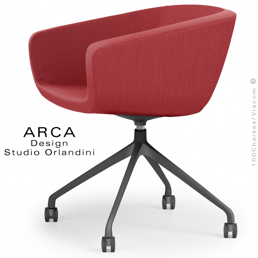 Fauteuil de bureau ARCA Mini, ou domestique, assise pivotante, habillage tissu rouge, piétement avec roulettes noir.