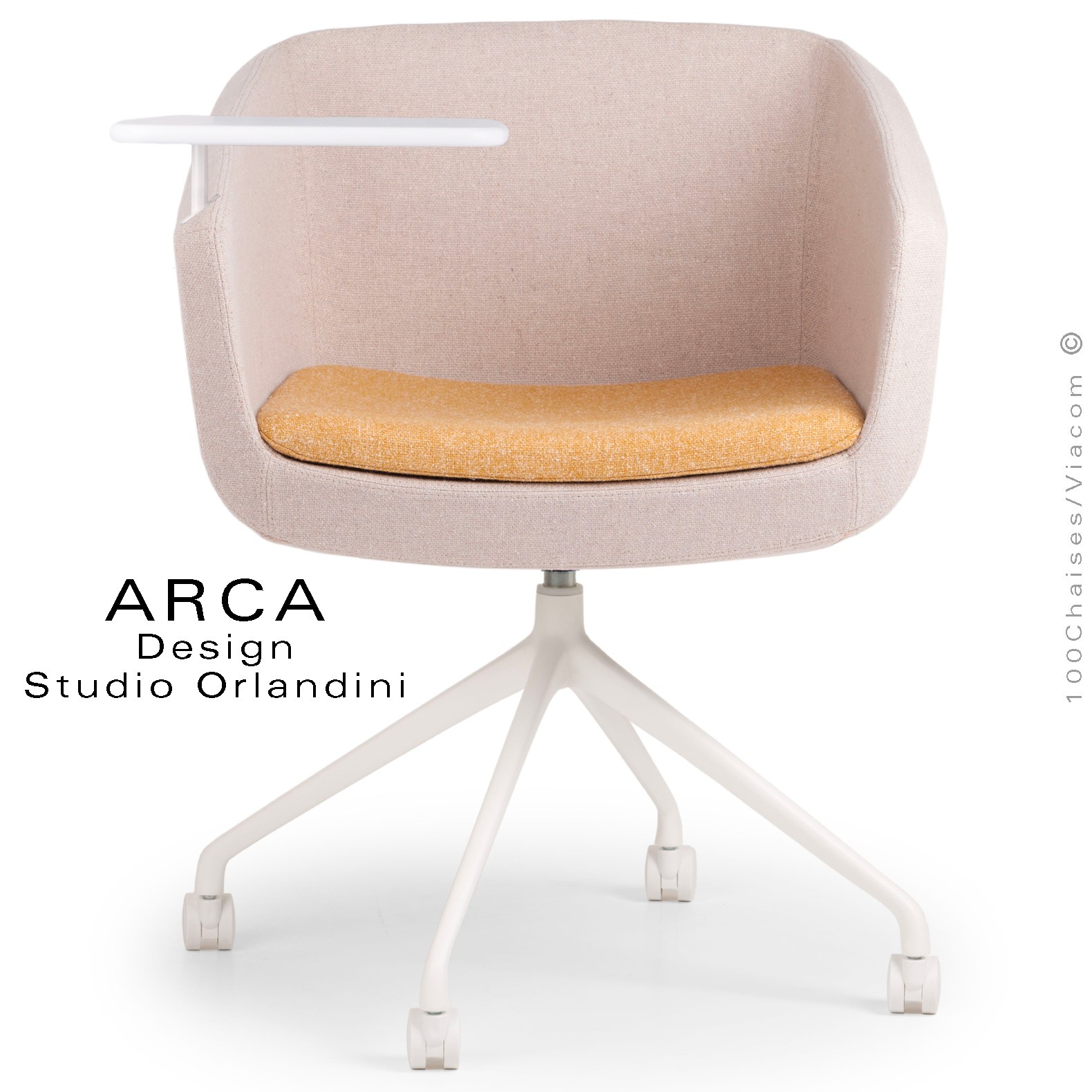 Fauteuil de bureau ARCA Mini, ou domestique, assise pivotante, habillage tissu, piétement plastique avec roulettes.