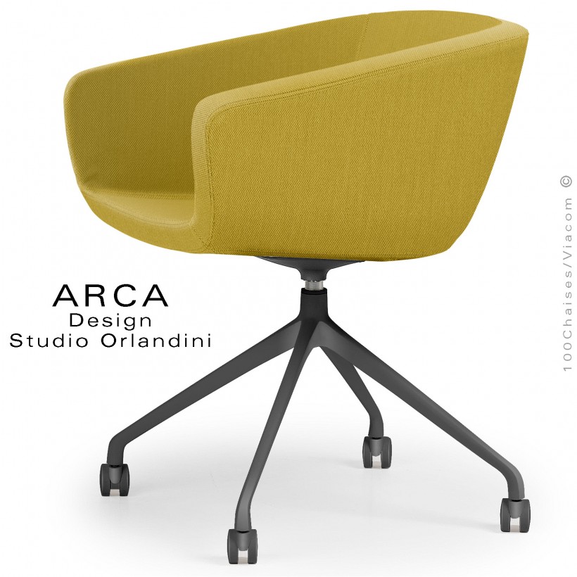 Fauteuil de bureau pivotant ARCA Mini, ou domestique, habillage tissu jaune, piétement plastique noir avec roulettes.