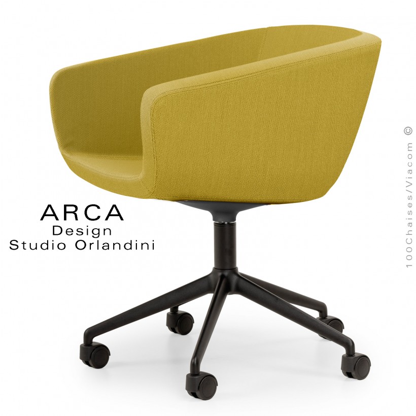 Fauteuil de bureau ARCA Mini, ou domestique, assise tissu couleur jaune soleil, piétement aluminium noir avec roulettes.
