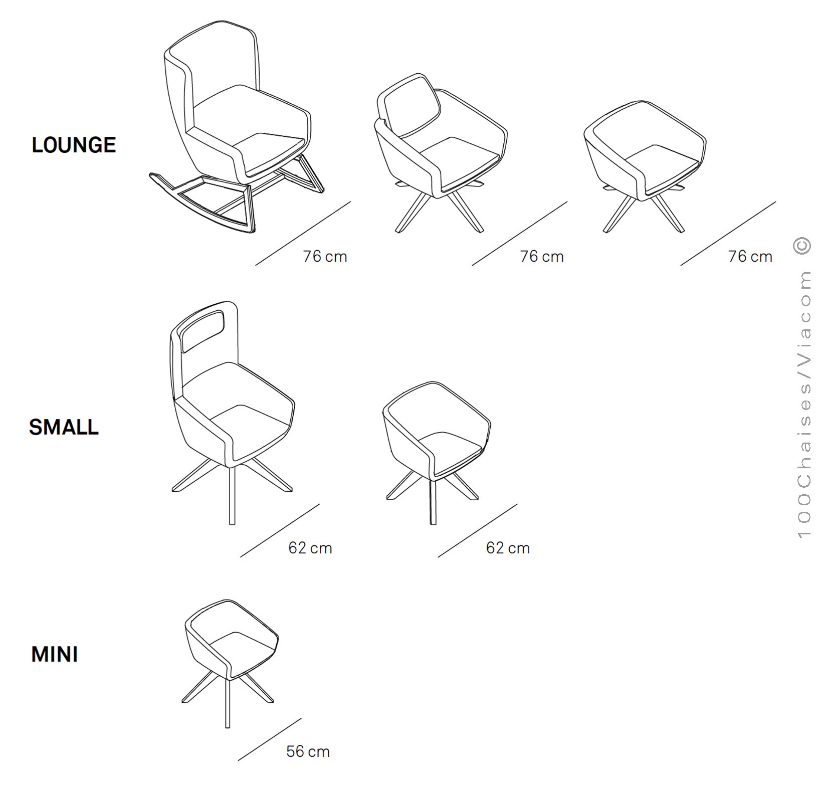 La variété de fauteuil, sièges lounge et fauteuil à bascule est disponible avec trois modèles de sièges distinctifs appelés Lounge, Small et Mini qui sont prêts à satisfaire tous les besoins et exigences en termes de taille, de couleur et de confort. Il existe également un nombre presque infini d’options pour la base, qui se présente sous la forme d’un pivot en acier ou en bois, ou d’une base en traîneau ou à bascule, pour n’en nommer que quelques-unes.